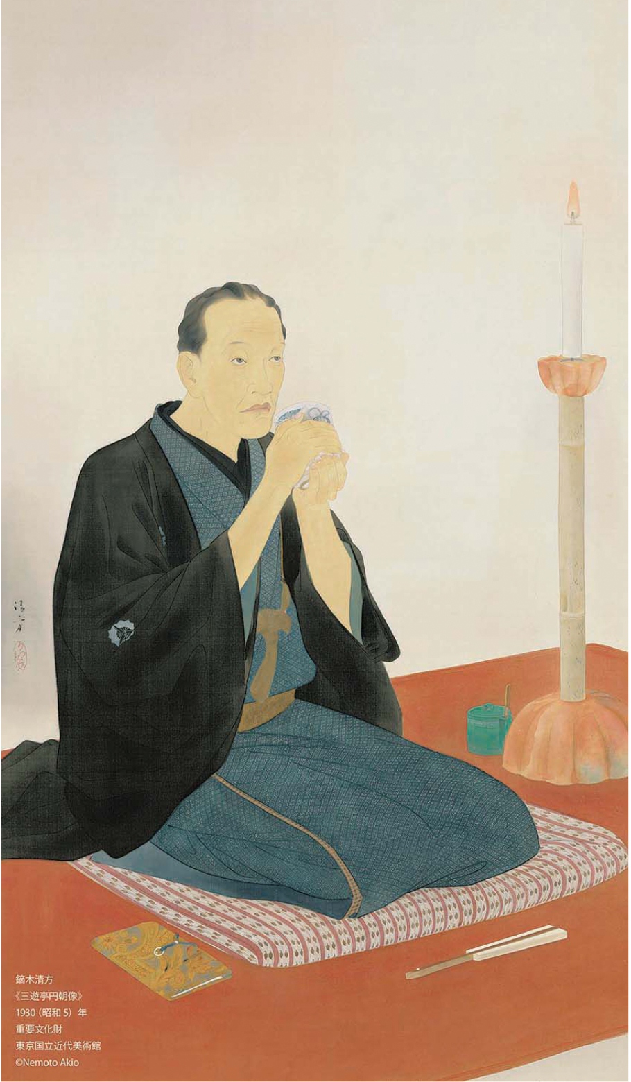 另一個未曾改變的是鏑木清方對小說、歌舞伎、江戶風俗與名勝景點的喜愛,繪製出以德川慶喜與樋口一葉為首的一系列明治代表人物。鏑木清方特意著墨在神情的表達,超脫寫實的形象紀錄,讓後世理解畫中人的性格功績。三遊亭圓朝是明治時期著名的落語家,因爲他的表演曾是鏑木清方父親的連載報導內容,使鏑木有了前往宅邸探訪的機會。透過實際描寫家中器物與配置,來更加渲染三遊亭圓朝本人的氣韻與姿態。