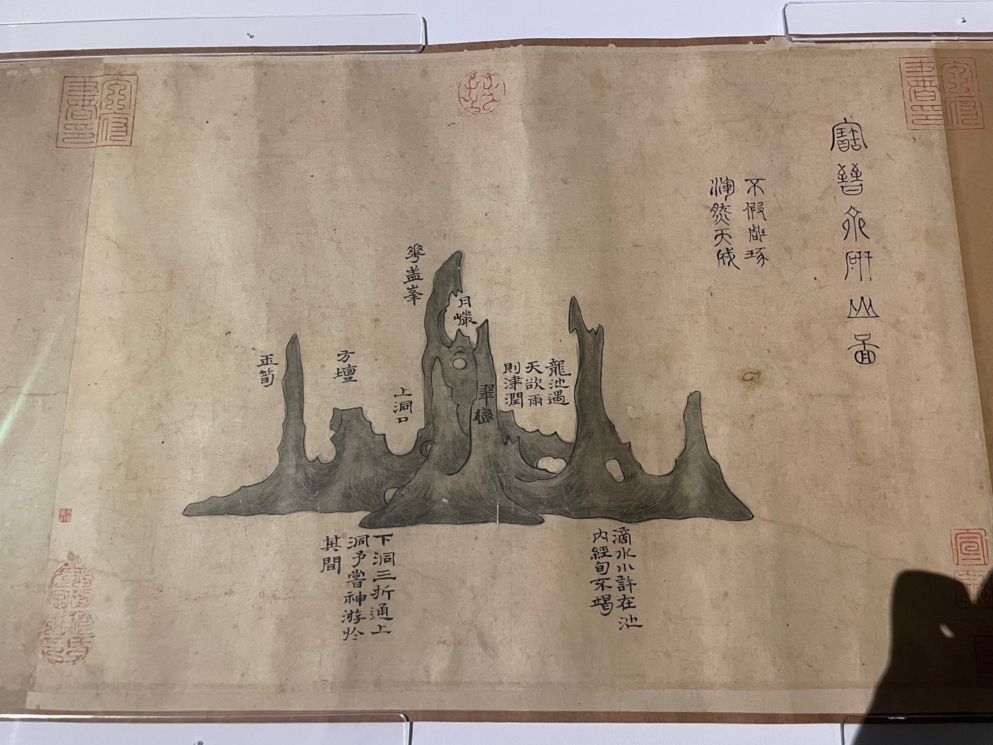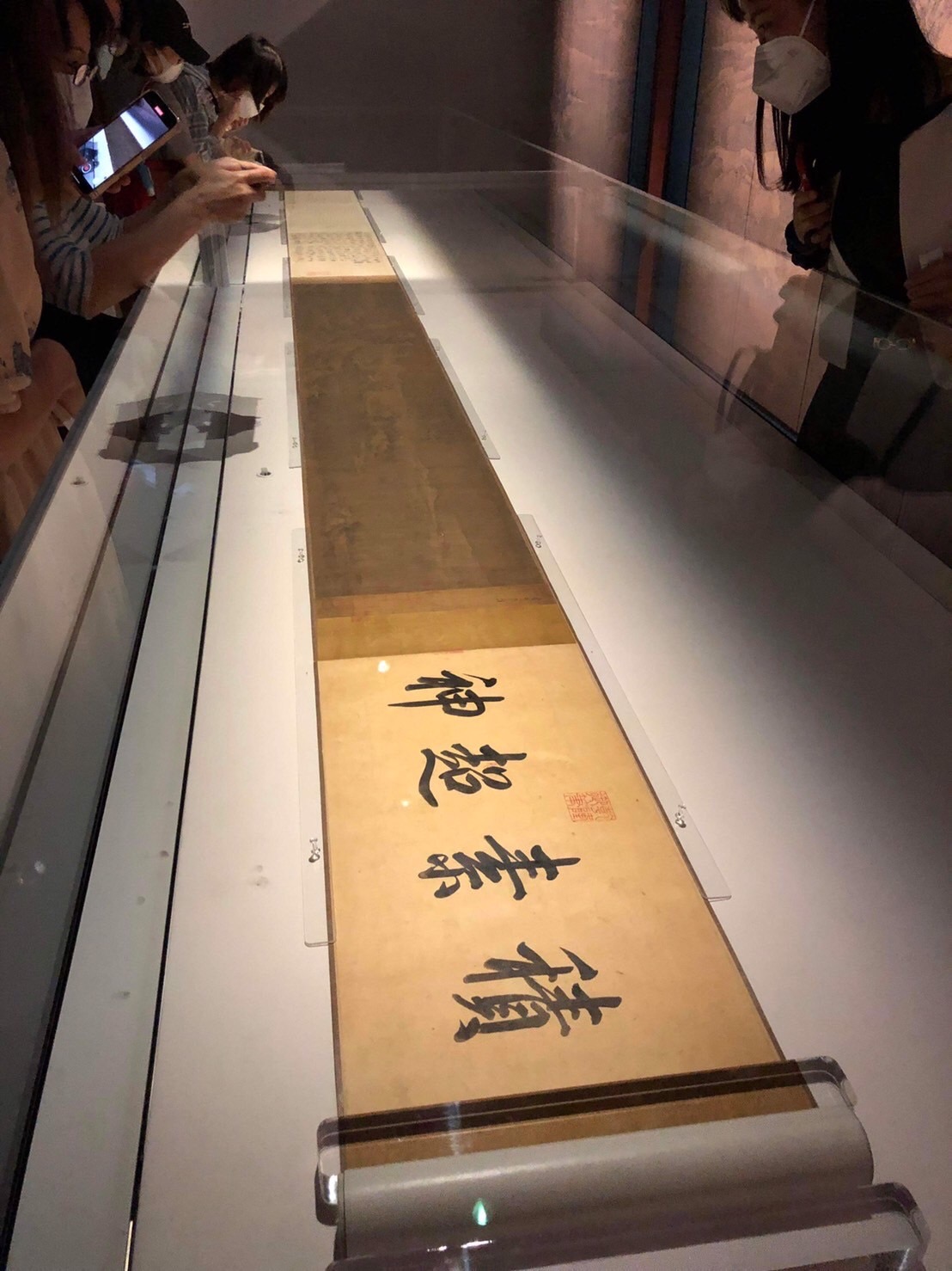 八號展廳的「國之瑰寶」位於博物館三樓,展覽共分三期,每期約為一個月,展出十件故宮博物院蒐藏的晉唐宋元書畫作品。七月展期以李嵩、趙孟頫、黃公望等宋元書畫家的作品為主,展品皆堪稱中國書畫史上的經典之作。展覽包括宋徽宗趙佶繪製的《雪江歸棹圖》,畫面上的層巒疊嶂,富有高低錯落的節奏感,讓觀者彷彿身臨其境,泛舟河上,眺望窗外不停更迭的醉人雪景,充分展示了長卷繪畫的魅力和特點。在簡介標籤中,策展人不但闡明《雪江歸棹圖》的藝術和歷史價值,更記有作品的收藏史,敘述畫作從清初入藏內務府,到1920年代被溥傑帶離紫禁城,及後於1960年代重回故宮的歷程。畫作之外,展覽空間還設有兩幅書法品,包括王羲之的《行書雨後帖(宋摹本)》和米芾的《行書研山銘》。米芾愛石成癖,於晚年喜得南唐後主李煜舊物「靈壁研山」。米芾對這塊靈壁石愛不釋手,於是揮毫留下《行書研山銘》讚美此石。
