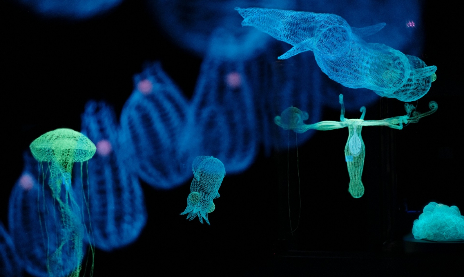 海洋生物之所以能發光有兩種原因,係由共生細菌發光以及本身體內產生的化學性發光,作用則為擬態、引誘獵物、迷惑敵人以及尋找同類與求偶等等。因此,在某種程度上,發光也可說是生命力的象徵,這些在黑暗中閃爍的熒光看似迷離虛幻,卻是海洋生物真切生存的證明。王筱雯以鍍銀銅線編織的鏤空形式,其通透輕盈的意象呼應深海生物經常為透明甚至是凝膠狀的身體結構;而作品擬仿生物的發光狀態,則是透過定時裝置照射UV光線,讓作品表層的塗料吸收能量後發光。隨著時間流逝,作品散發的光芒也會逐漸暗去,需待下一次的UV光線再次補足能量,這種明滅交替的循環狀態也暗指生態系統的永續現象,一旦體系失衡甚至當物種滅絕後,這樣的發光機制也終將不復存在。