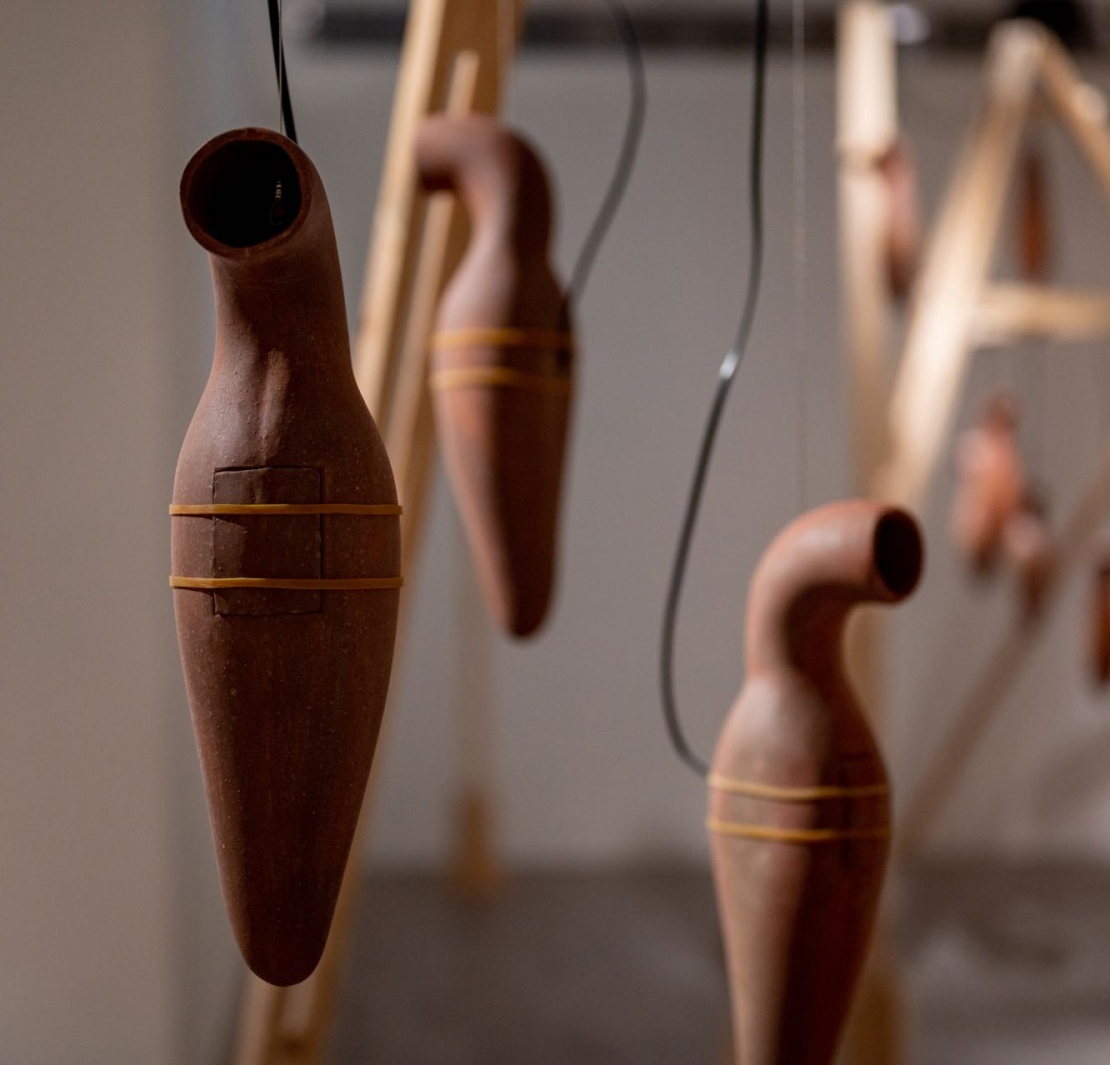 接下來的《山麻雀之歌》,則是蔡咅璟在展場中用木條架起像山一樣的三角形狀,並在上面掛上長條狀的陶壺,陶壺內安裝會發出山麻雀叫聲的發聲器。