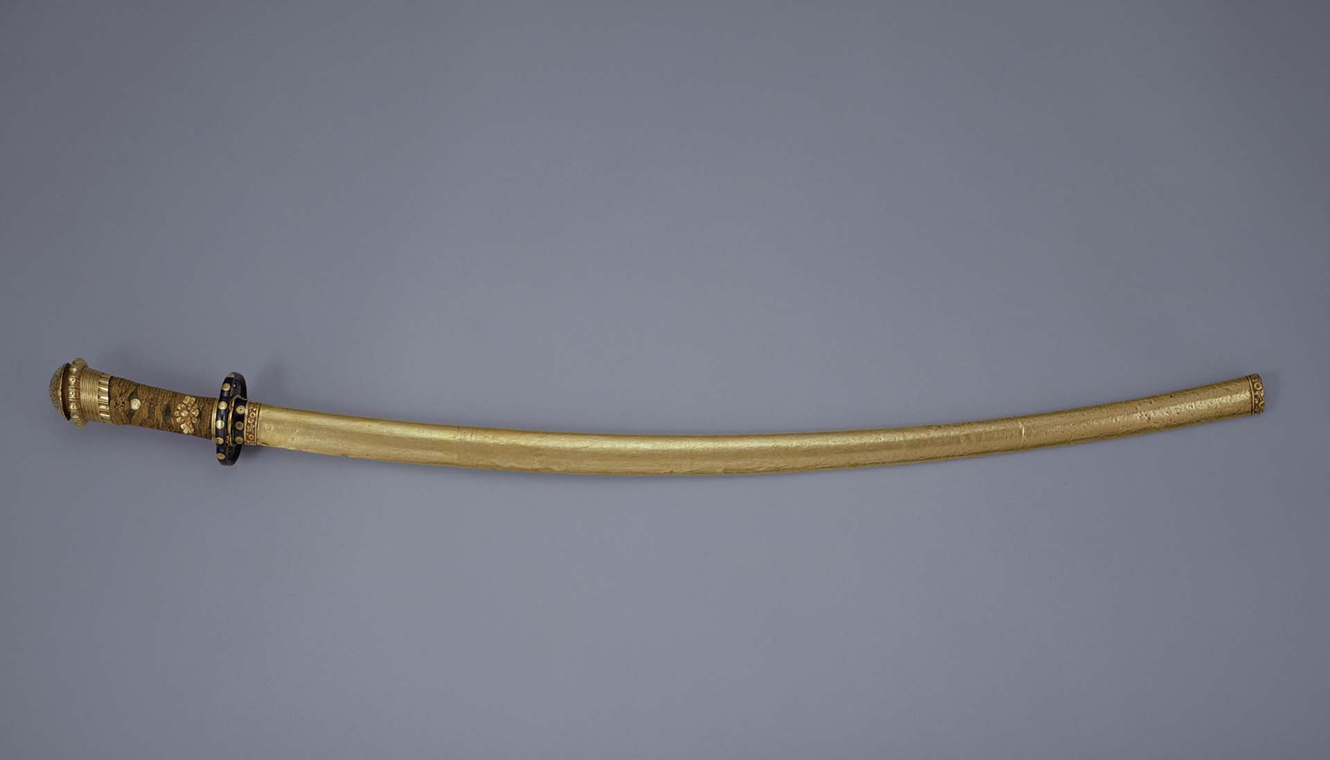 《金裝寶劍外裝》(號千代金丸)、《青貝螺鈿鞘腰刀外裝》(號北谷菜切)、《黑漆脇差外裝》(號治金丸)是琉球國王第二尚氏王室的三把傳家寶刀。日文品名「拵」,指的是刀身與刀柄、刀鞘等刀裝具裝配完畢的形態。其中《金裝寶劍外裝》尺寸最大,屬於武士刀中的太刀,刀鞘上全面纏繞薄薄的金板,柄頭上安裝竹節狀的鐶;《黑漆脇差外裝》和《青貝螺鈿鞘腰刀外裝》的刀鞘上,則分別塗滿了黑漆和嵌上青貝螺鈿,呈現出不同的裝飾美感。