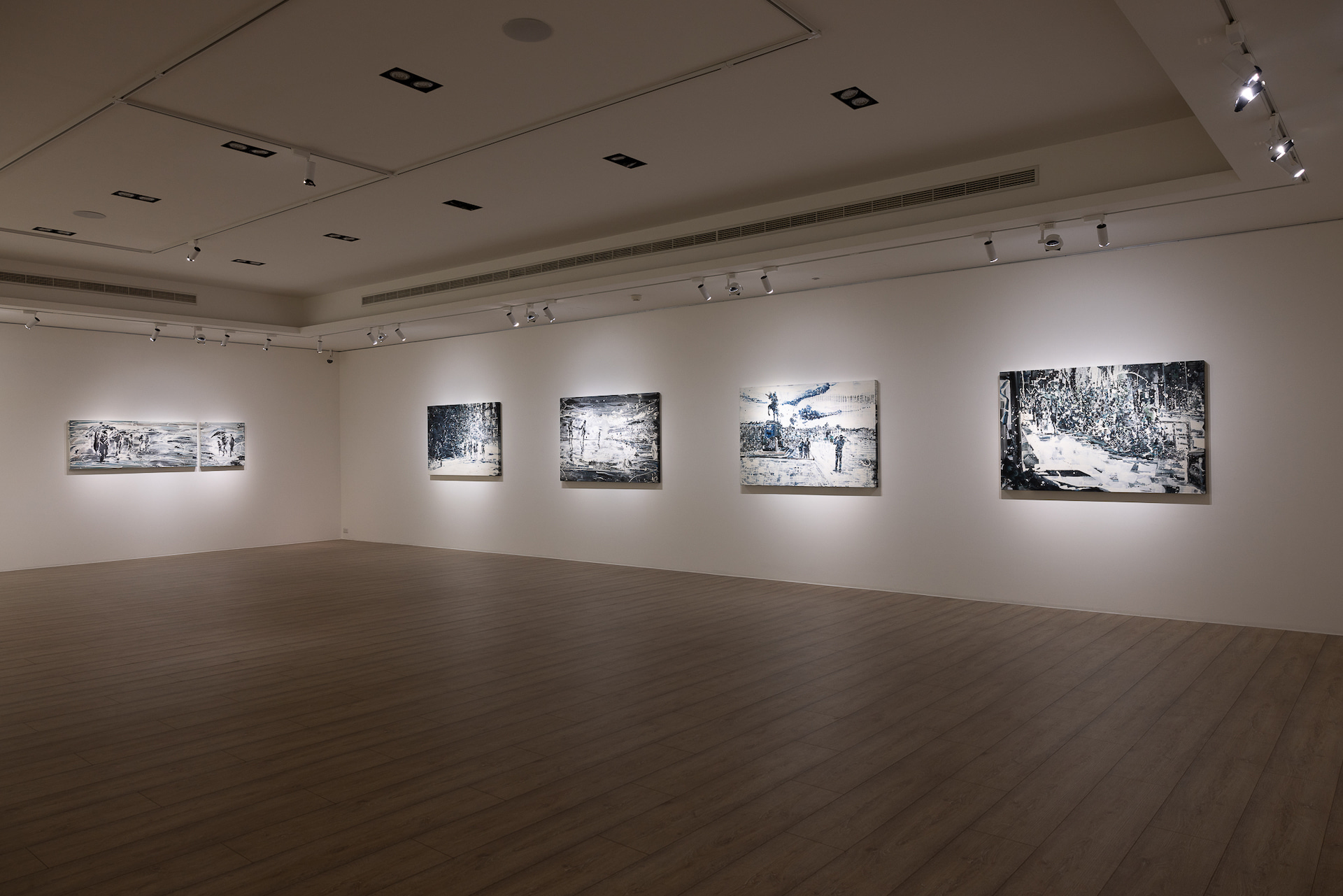在這個意義上,邱建仁、周代焌、温孟瑜與黃舜廷在自身繪畫創作的後方,各蘊藏著不同媒介的視覺經驗對話。四位藝術家之間在影像與再現經驗、圖形與圖像、筆觸與製圖思維等面向上有著多向的對照。例如,在邱建仁與黃舜廷的繪畫中,影像與視覺再現的關係,在相似的命題裡卻表現著殊異的美學對比。邱建仁從日常生活攝影取樣視覺性,將畫面每一處以不同筆刷運動作為構成這個世界的位元,取代本來影像中均質化的像素粒子。藝術家以低彩度油彩再構一種解離形象、具有平衡感的新景象。一如藝術家的自我陳述: