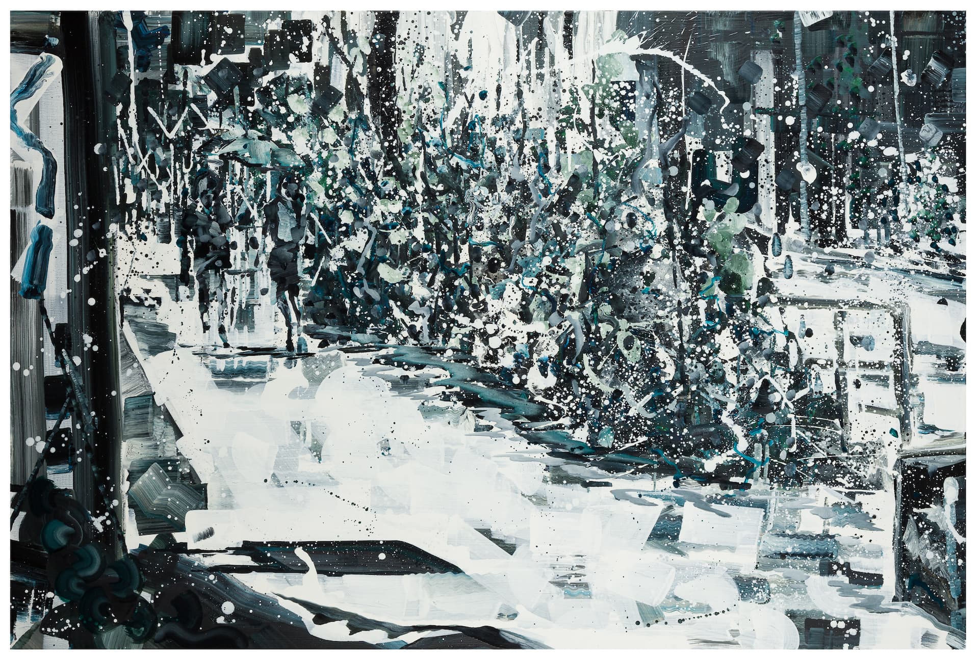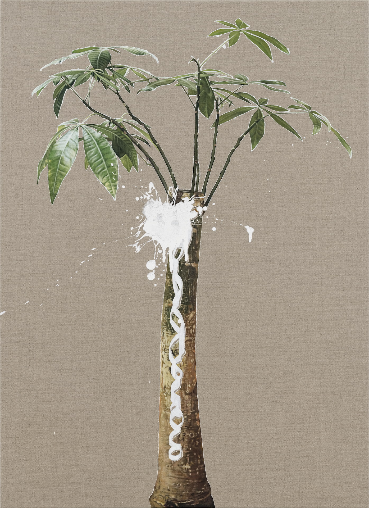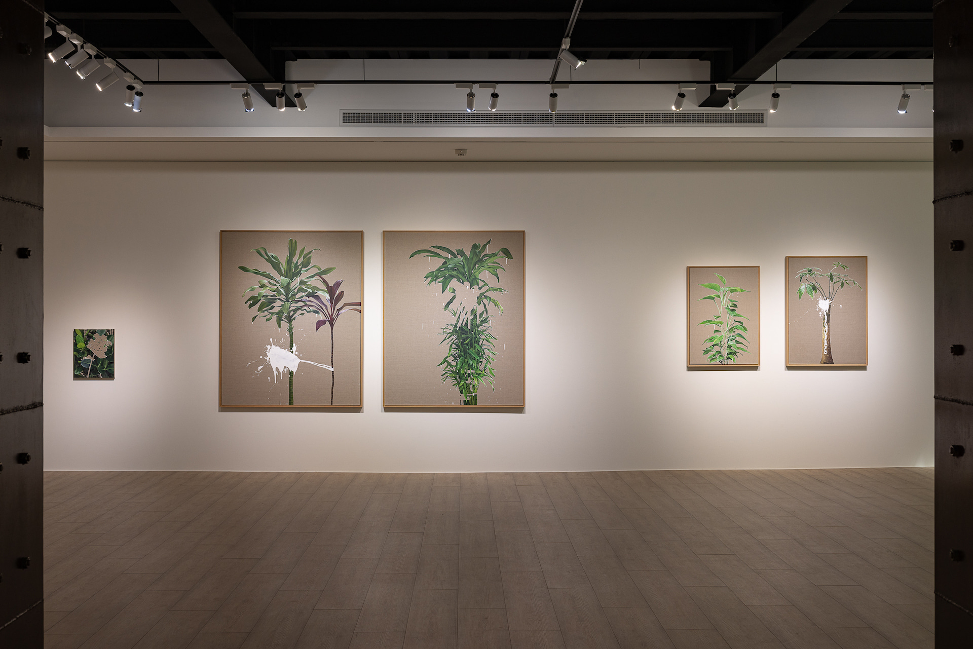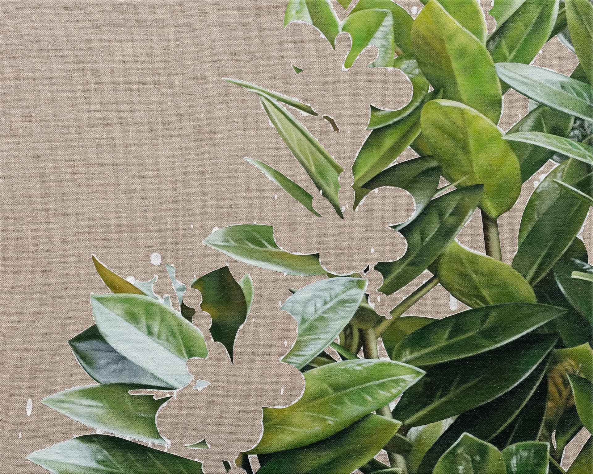 諸如此次展出充滿具象寫實語彙的《空白》系列繪畫新作中,即可看出藝術家在植物形象的質感上,表現數位影像中的平面化景深,而非以顏料、肌理和筆觸堆疊錯視空間。藝術家將這些圖像、看似恣意潑灑的白色顏料都化為如數位修圖軟體般的圖層空間,將繪畫表現中、常被觀者用來親近畫面的理性與感性,藉由精確的製圖方法成為一部掃描機器般,將空缺、單色、數位感形象與物質上傳到畫布表面,編排疊加。