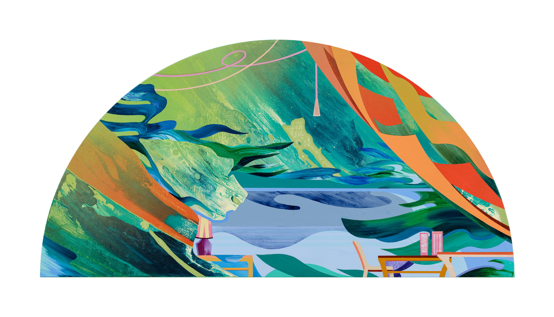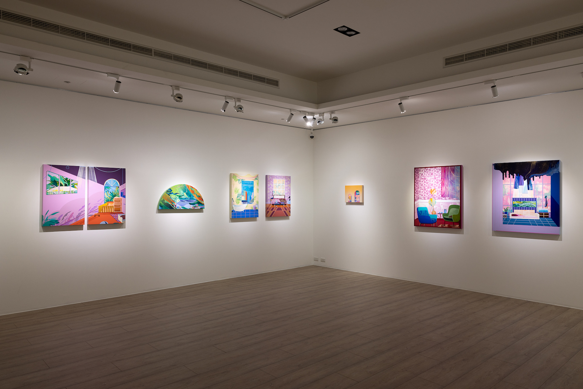 我們亦可以從温孟瑜與邱建仁的繪畫中,思考所謂「繪畫之整體性」如何在不同的繪畫實踐中各自表述。在温孟瑜的繪畫裡,空間與事物時常保有一種現代主義家居式的簡潔邊線,每個空間平面化為不同的圖形輪廓——就連氣氛也有輪廓線。與其說那些畫面中的生活情景是為了讓人們身歷其境,不如說他更像是藝術家將其化為一塊一塊不規則的畫布空間,並以色彩與視覺的整體感為依歸所創造的世界。它關於內在,卻並不輕易靠向身體性與精神性。