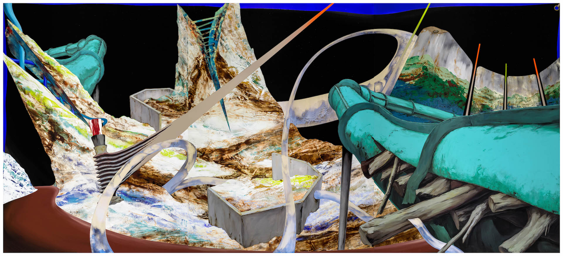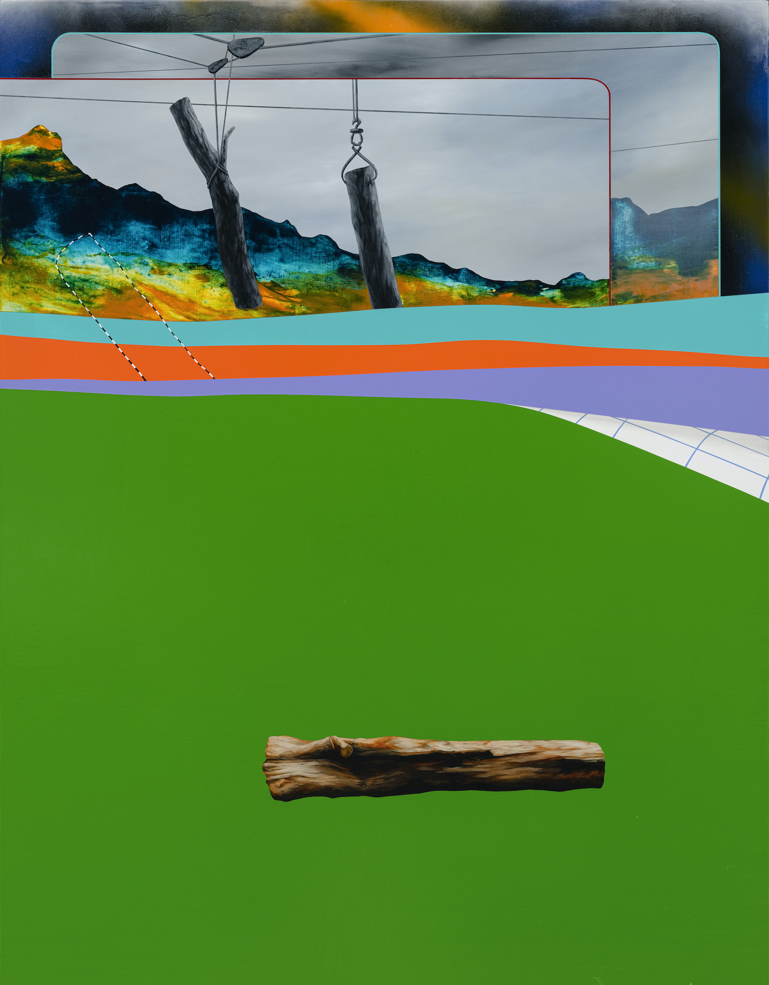 風景畫於17世紀的再復興,與臺灣史的進程同樣都受到帝國主義(例如荷蘭黃金時期)影響。四百多年來,作為他人眼中所欲征服的風景,到現代化發展的過程中,人類文明活動對於地貌的宰制與部署,在羅伯特・史密森(Robert Smithson)式的地景藝術(Land Art)達到了嶄新的層次,而環境藝術美學則批判著這種人類本位的藝術視角,引動了後續以自然環境為本位的藝術思潮。這種對待風景與環境的美學轉向,呼應著藝術家十一年來在畫布、數位空間、田野踏查等經驗中所形塑的一種後風景畫特質——以他者視角取代主觀情感(註2),表現現代化工程與自然之間彼此穿鑿並置的當代環境。一如在《事件的後方》裡,周代焌繪畫中經典的冷暖混染著色如同拋光過後的變質岩切面,與單色的原色、虛線與白色方格之間的畫面編排,簡潔揭示著藝術家思考環境與技術調度的冷調與巧思。