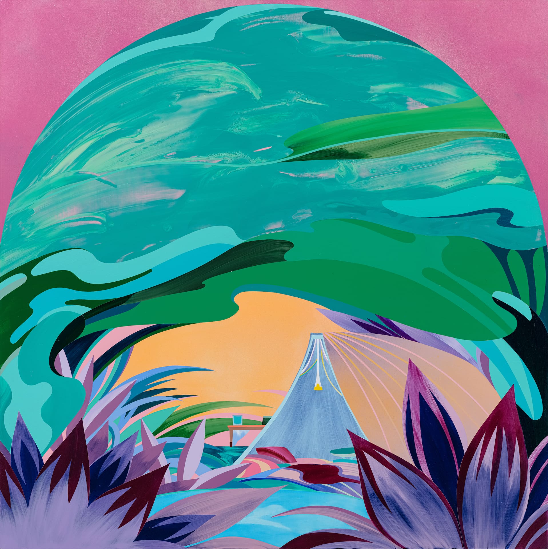在邊界裡位移、穿越,周代焌藉由繪畫超越物理標量,也從不同的技術工具中抽取美學,以繪畫回應自身關注的環境之複雜性。自2011年的《全球寂靜014-橫貫中部》從日本311大地震的事件影像作為啟發藝術家看待災難之力如何影響關鍵區(critical zone)的源頭,並以台灣「中部橫貫公路」為描繪的對象,藉壓克力繪畫的圖層技法臨摹數位像素視覺,重構人類世之下的山脈與風景。藝術家在畫中對於地方與環境的關照,揉雜著地理經緯與歷史縱深,而或許與從風景畫到環境藝術的美學意識轉向有關。