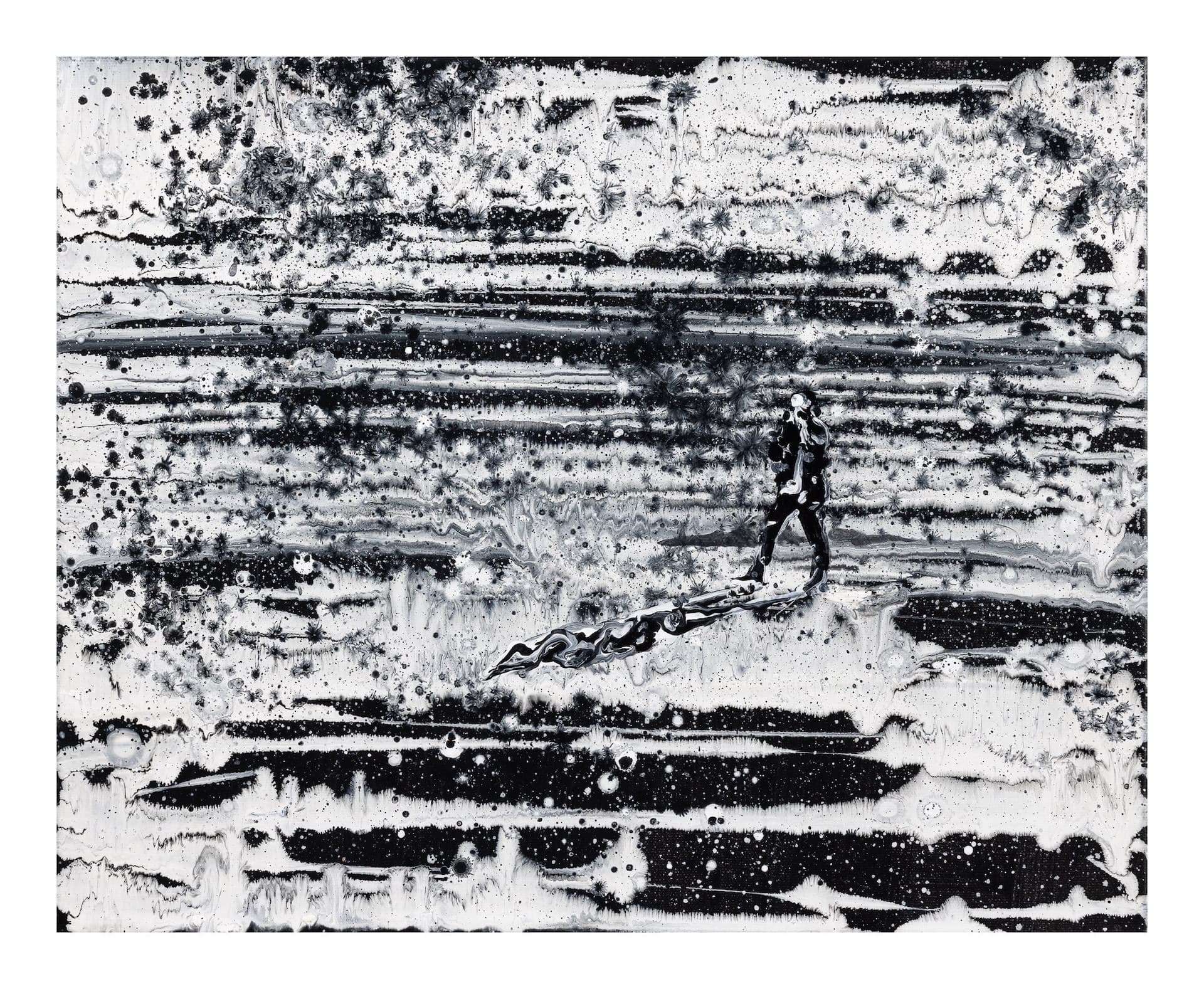 而在《現在你是回憶》、《多年前的事了》等作品裡,人形在橫線的世界中或行走、或互動、或招手。邱建仁在這幾件作品裡,讓顏料表現更多細緻地流動、暈染與落撒。這些人形與背景世界有時屬於不同圖層,有時則融入背景,共處同一次元。在這樣的分類視角中,《與光同晨》是「之間的平衡」集大成的作品。畫面描繪了藝術家時常在創作中表現的雨景題材,一小群撐傘的人們聚集在單色且碎形的筆觸世界之中,白色顏料與靛黑色顏料隱含著一股以人群為中心的向量感,使人物如同佇立在風暴的廣場之中。