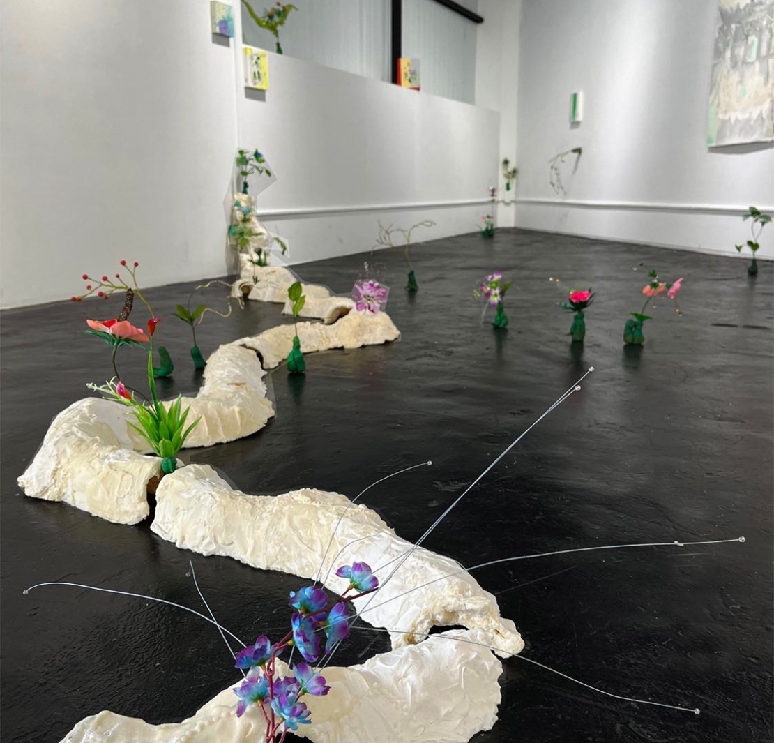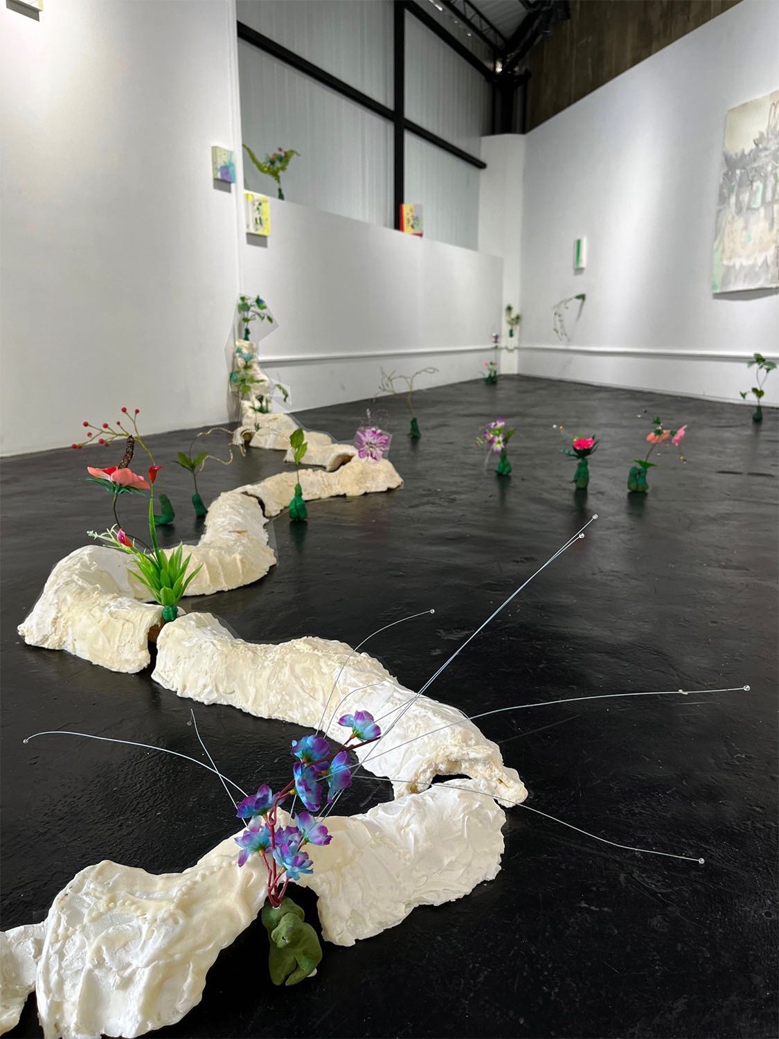 我想以皂的寓意來延續自身對「春藥」概念的解析,個人很喜歡皂在此展中內外顯的寓意。它使用的過程充滿儀式性,使用完後除了獲得新的狀態外,也夾帶些許氣味隨之流動,好比展場地面上,一塊塊明確、具體的皂線塊,它們的排列指出線條分明的方向,但空氣中混雜著淡淡的皂香,這些有形的線條與無形的氣味,似乎試圖模糊了什麼;而分佈在線塊週圍的小地精們,又拓延或突顯人與人之間的親密/私密性。那如手指般大小的人形肉芽,兩兩合為一體,從細縫中開出一朵朵的花,這些小地精們除了承接創作脈絡外,也讓慾望的支流另闢新徑。