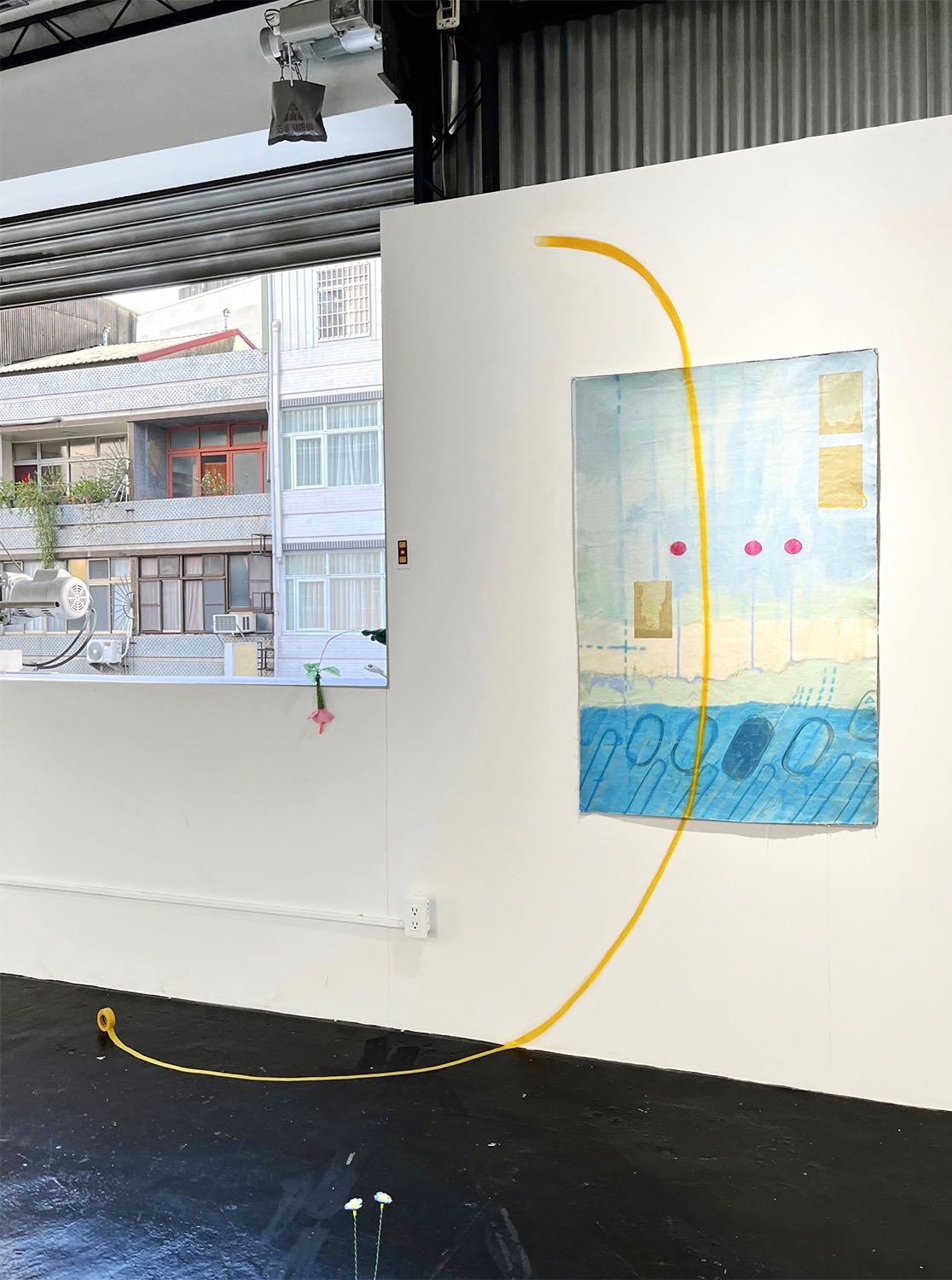然而另一個有意思的地方,幾乎每幅畫作雖表現出一種暫居的狀態,但又從畫作中延展出一條條新的路徑,從畫布延伸到牆面的路線是噴槍所延續創作的路徑,然而接到地面時又轉換成電火布膠帶,而每條膠帶的開展到某個點即停止,創作者並没有撕斷它,反而保留圓型環狀的狀態。個人覺得這是種身分移動與接地的軌跡線,如同創作者因家庭背景文化的不同:從小到大就在台灣與澳門兩地移動,而現今又在法國唸研究所,移動的間距又拉了更長。這樣長期移動的狀態對於自身的身份認同某程度反映在她此次作品的展陳上,浮動的畫作、試圖開展的路徑、思考如何接地的轉繹與留下可被延續的契機,個人很喜歡屈薇薇在展場中留下許多的路線指引。
