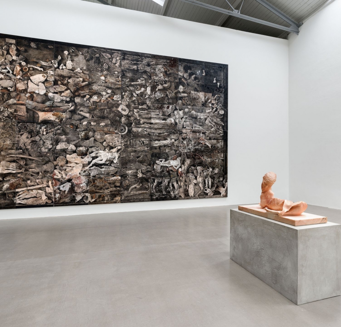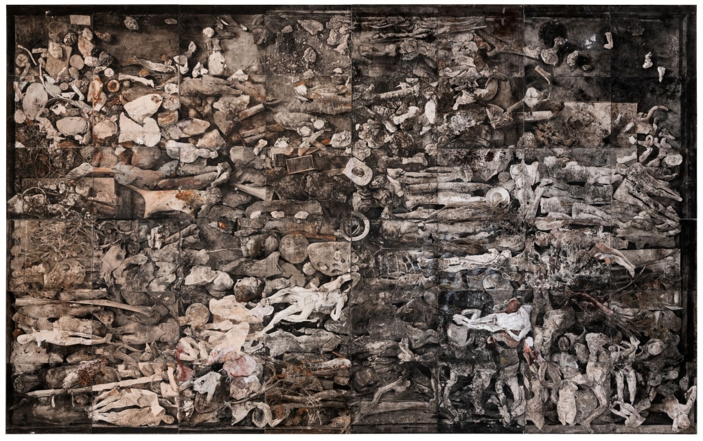 而展場中尺幅達五米高、八米寬的懾人作品《Campo dei miracoli》,不單僅是體現藝術家想要創作無限之境的繪畫欲望。怵目的畫面由層疊滿佈的人體殘骸或傾垣遺跡、石塊等碎片所組成,彷彿歷經一場慘烈爭鬥的戰亂或不可抗力的天災,同樣充滿著薩莫里一貫風格的壓迫感,瀰漫著明顯的死亡意味,而充滿細節的畫面之繁複更有如仍在增生般,未曾靜止地持續往衰敗的狀態推進。如揮之不去的夢魘般,似乎正處於臨界點的邊緣,瀕臨潰散卻也呈現出隱晦而極致的陰鬱美感。