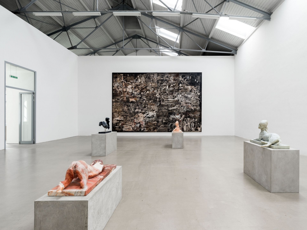 繪畫與雕塑是薩莫里在創作過程中並行轉換運用的兩種主要媒介,「在顏料的味道使我難以呼吸時,雕塑總是回到我的生命中;而繪畫則是將我從雕塑的粉塵中解救出來,這兩者總是成為另一方的解毒劑。雕塑是繪畫性的,繪畫也是雕塑性的,而在展覽裡展出的作品也是彼此延伸出來的。」儘管此次展覽以一組四件人面獅身造型的大理石雕塑以及一件巨幅混合媒材平面作品《Campo dei miracoli》為主,卻不是在創作之初就被藝術家納入一起構思,更分別在不同的工作室製作完成,直至畫廊的展覽空間才彼此相遇,「他們逐漸形成不可分割,對彼此相互癡迷的存在。」薩莫里如此描述這些作品的依存關係。然而,作品的相遇仍不直接,這四件雕塑雖然皆擺放於畫作前方,然而頭部皆向側邊傾斜以致視線並未直視畫作,彷彿各自沉溺在藝術家所賦予的敘事當中,顯得更為關注於自身的狀態,而拒絕凝望畫面當中那些瘋狂的內容,至於能夠在展場中走動的觀眾亦難以與他們的視線相對。