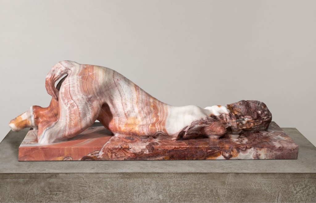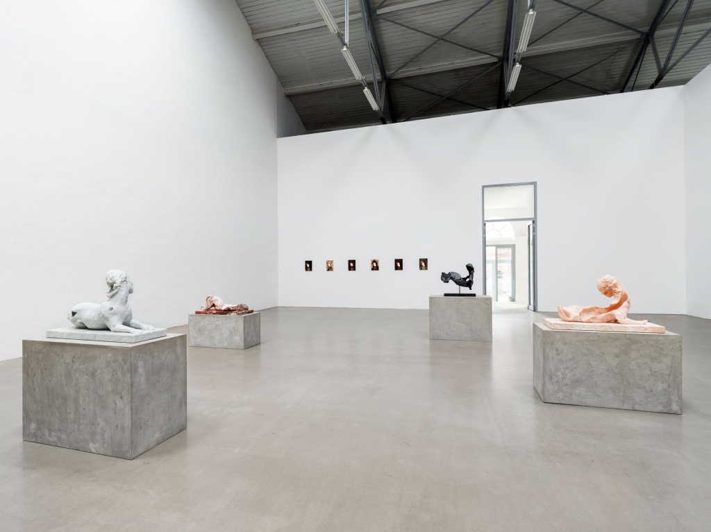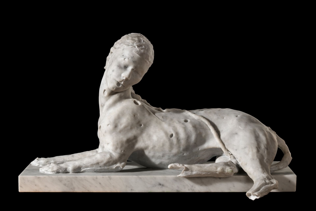 薩莫里憶及,人面獅身像是自己兒時坐在地上所雕塑的第一個主題,而時隔40年之後,不經意在羅馬附近的維泰博城市博物館(Viterbo Museum)裡再次看到了一批中世紀的雕塑,當中有一件由帕斯誇萊.羅馬諾(Paschalis Romanus)在13世紀所作的人面獅身像,不同於更多人熟知的埃及人面獅身像的神聖象徵以及端正盤踞,那件作品的頭部轉向側邊,激發薩莫里重新以此作為創作靈感,並且在考古學與現代技術之間找到平衡。本次展出的四件雕塑雖然源於同一件原始模型的母體,但經過不同石材的再製、不同時間的轉世而擁有各異的姿態。他們更大幅度地扭轉身姿,呈現出一種更為中性、曖昧且戲劇化的形象,其不完整的軀體彷彿像是氣力逐漸消散的疲軟狀態,終將全然沒入底座之內。