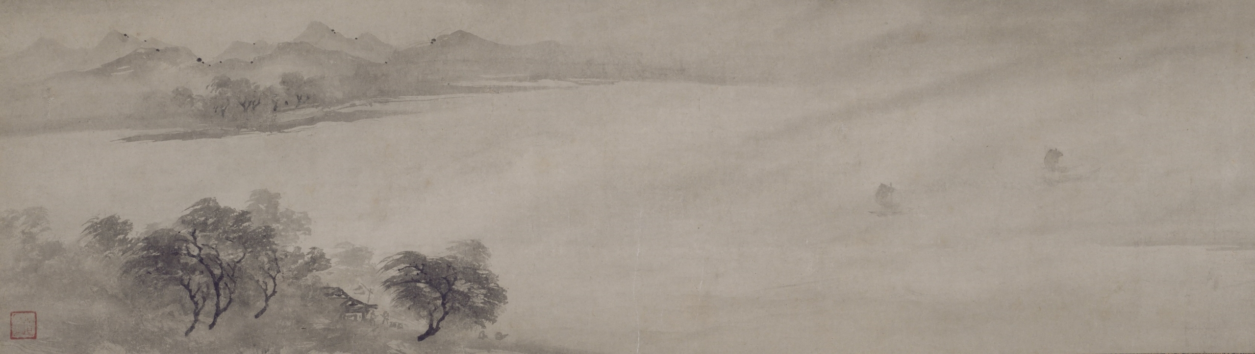 傳牧谿《遠浦歸帆圖軸》原是以瀟湘八景為主題的畫卷中一景,室町幕府第三代將軍足利義滿(1358-1408)為室內陳設而將畫卷截斷,並重新裝裱為掛軸。以裝點茶室壁龕的掛軸形式,深受歷代掌權者與茶人們的推崇。此幅作品用水墨的微妙濃淡,表現了從水面刮向岸邊的強風與在霧中若隱若現的船影。