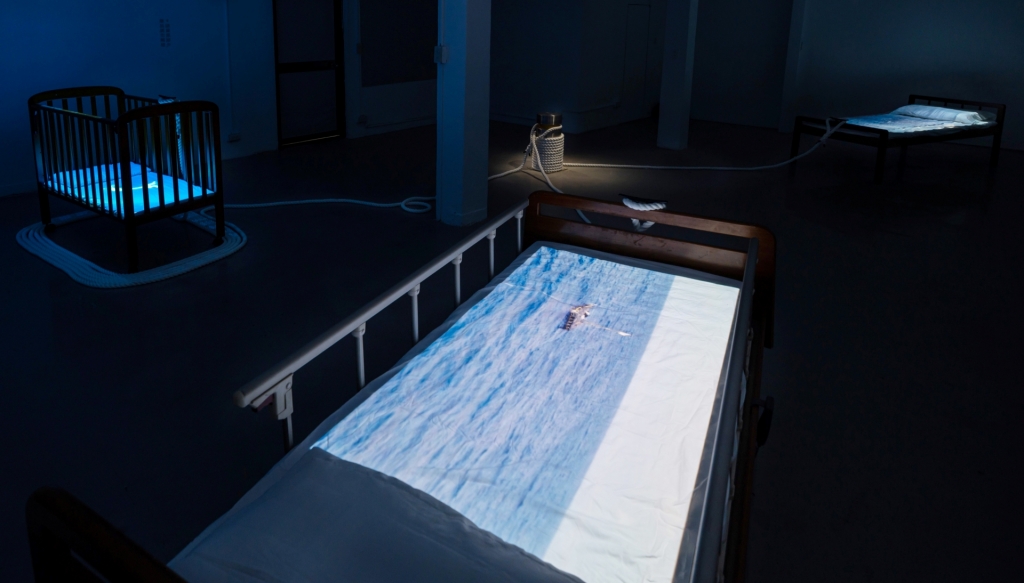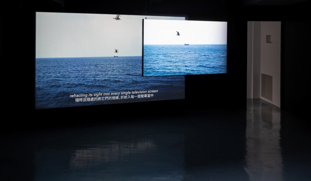 黃嘉俊的《上船.上傳》為錄像結合三張床的裝置,床為人們入睡作夢的場域,而嬰兒床、木床、病床分別象徵生、老、病的人生階段,是抽象感知與生理狀態交會、承接虛實的載體。同時,床在此也借指船隻的意象,投映在其上的海洋錄像有航向未知的意喻,如飄遊在夢境當中。而吳其育的《高速落海》奠基於1996年的台海導彈危機,他將攝影機裝設在不同載具之上,達成另一種穿越島嶼的方式與想像,並透過雙螢幕投影的設置讓閱聽內容產生疊合,呈現多重敘事的切入角度。