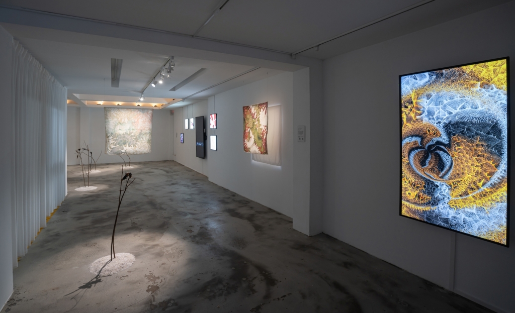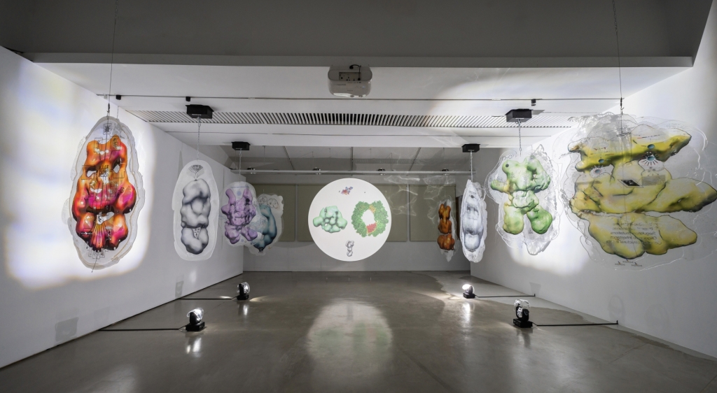至於愛沙尼亞藝術家卡佳.諾維茨科娃(Katja Novitskova)的《微生綠洲》則以蛋白質資料庫的上萬筆資料作為採樣,將這些結構圖形透過AI生成器合成出全新的狀態,再從中選出近似臉譜的圖樣製作成大型的懸吊裝置,搭配展場中猶如顯微鏡的螢幕所投映的蛋白質圖像正在不斷遞變異與流動,讓觀者得以比對實際資料與藝術家再創圖譜之間的異同。