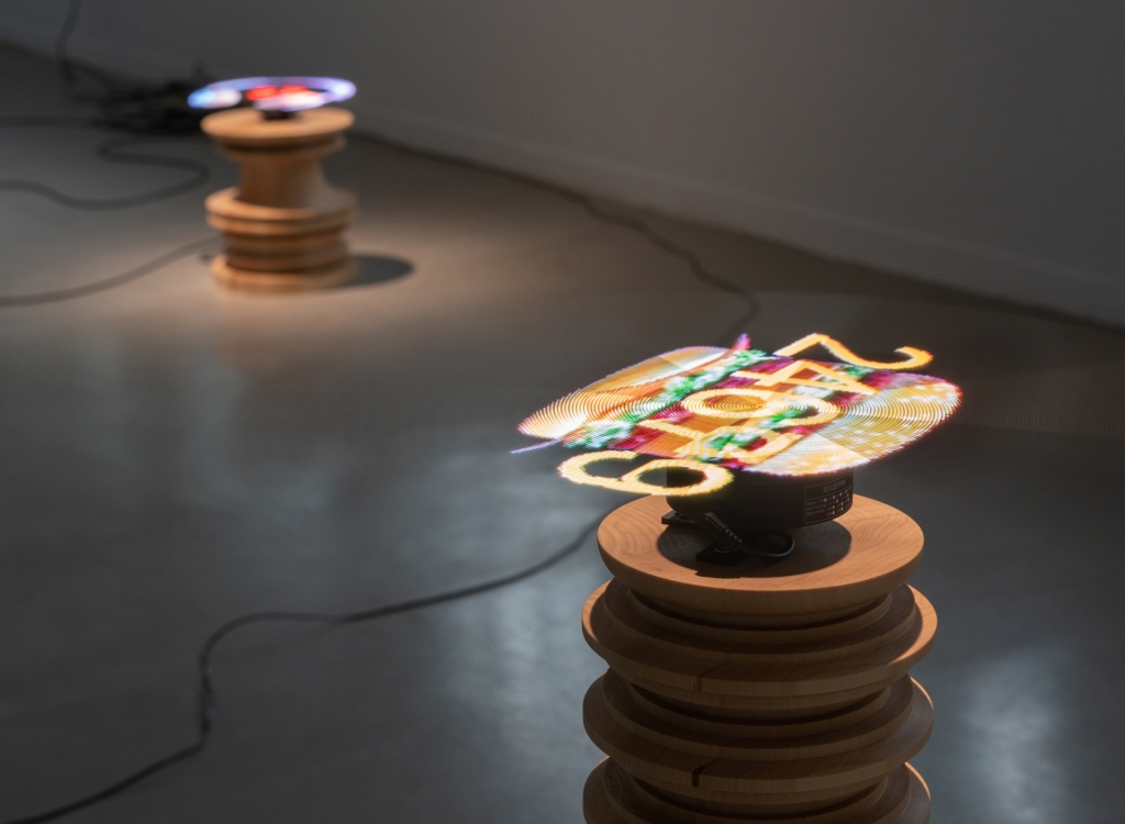德國藝術家菲托.薩格雷拉(Fito Segrera)的《一把與N把椅子》以觀念藝術家約瑟夫.科蘇斯(Joseph Kosuth)在1965年發表的經典之作《一把與三把椅子》為發想;並透過圖像辨識軟體,將實體椅子的形象、概念再度進行當代語彙的拆解與詮釋,改以演算法取代哲學思考,透過網路無限循環地進行資料蒐整與產出與椅子相關的文本跟圖像。而德國藝術家亞歷山德拉.多瑪諾維奇(Aleksandra Domanović)的《世界即時統計數據》以雕塑結合LED全息投影風扇,自「Wolrddometer」網站抓取各國於每日的COVID-19確診、死亡以及康復人數等數據,在高速轉動的扇葉上閃逝而過。儘管現在已進入後疫情時代,然而似乎還看不到終結狀態的疫情變化仍在每日牽動著世人的情緒波動與生活狀態,大幅改變人類看待歷史與前景的態度。