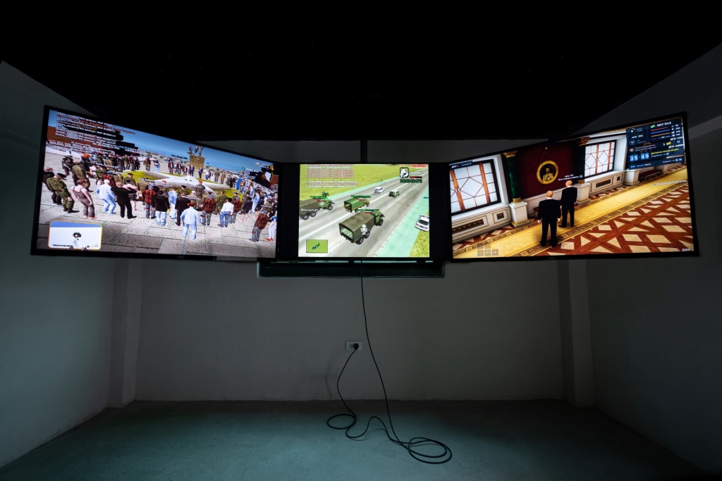 數位藝術團體「張海英重工業」的《藝術史之終結》以三段影片「藝術史之終結、錯了、實際行動」所組成,透過不斷更迭的提問字幕與背景畫面,持續拋出對於藝術本質、現實生活等的質疑、觀察以及回應,如同自我剖析般的直白告解,卻也像是對觀者拋出同樣的探詢提問,進而誘發思考。而兩位俄羅斯籍藝術家迪娜.卡拉曼(Dina Karaman)和弗拉基米爾.納登(Vladimir Nadein)因為政治因素出走而成為流亡電影工作者,透過《角色扮演檔案》計畫將經典遊戲「俠盜獵車手」(GTA)的非官方修改版「罪惡俄羅斯」(GTA:Criminal Russia)做為素材,大量蒐集實際玩家的遊戲影像予以剪輯,將俄羅斯境內的動盪現實帶入虛擬的遊戲情境,以諷刺掌權者將暴力合法化的蠻橫現況,以及衍生出對於各國政經環境所造成的衝擊。