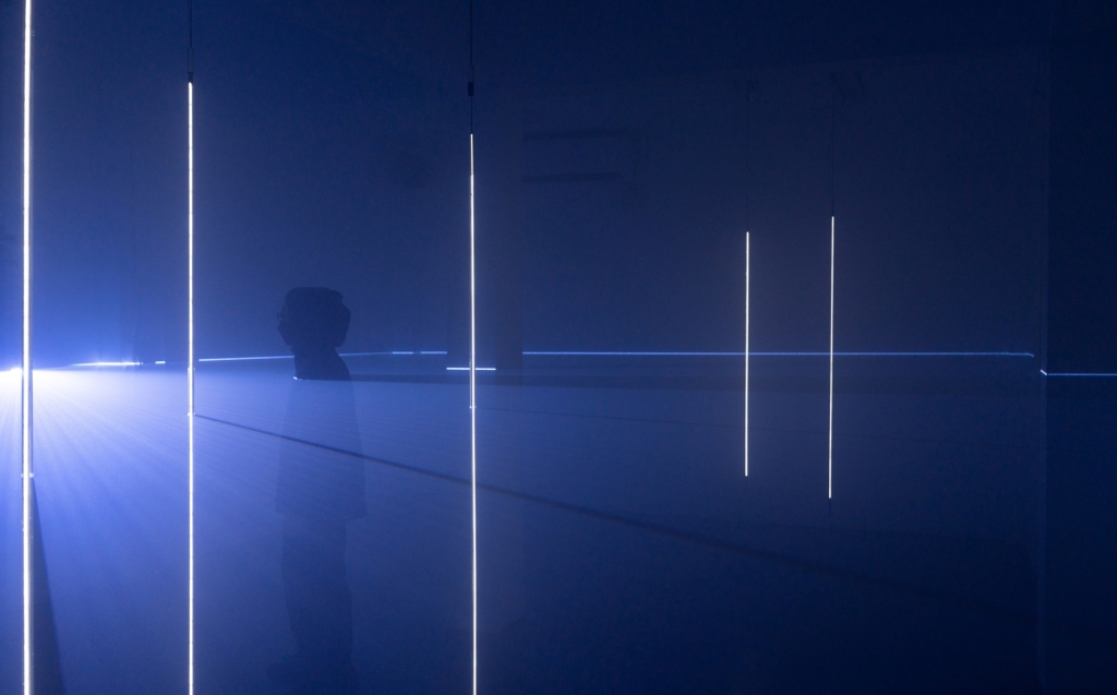 而陳乂的《率》也同樣以加密貨幣的市場狀況為創作基礎,投映於螢幕上的100枝光柱分別代表不同的加密貨幣,並根據漲跌數據帶動光線明滅程度,而這些光柱皆懸浮在暗潮洶湧的數位海浪之中,其水面的波動起伏也是即時市場價值的連動效應。而當觀者置身於煙霧瀰漫、光束掃射的沈浸式展場裡,更能深刻體會到虛擬世界的交易消長狀態,從中感受價值與欲望的複雜與不確定性。