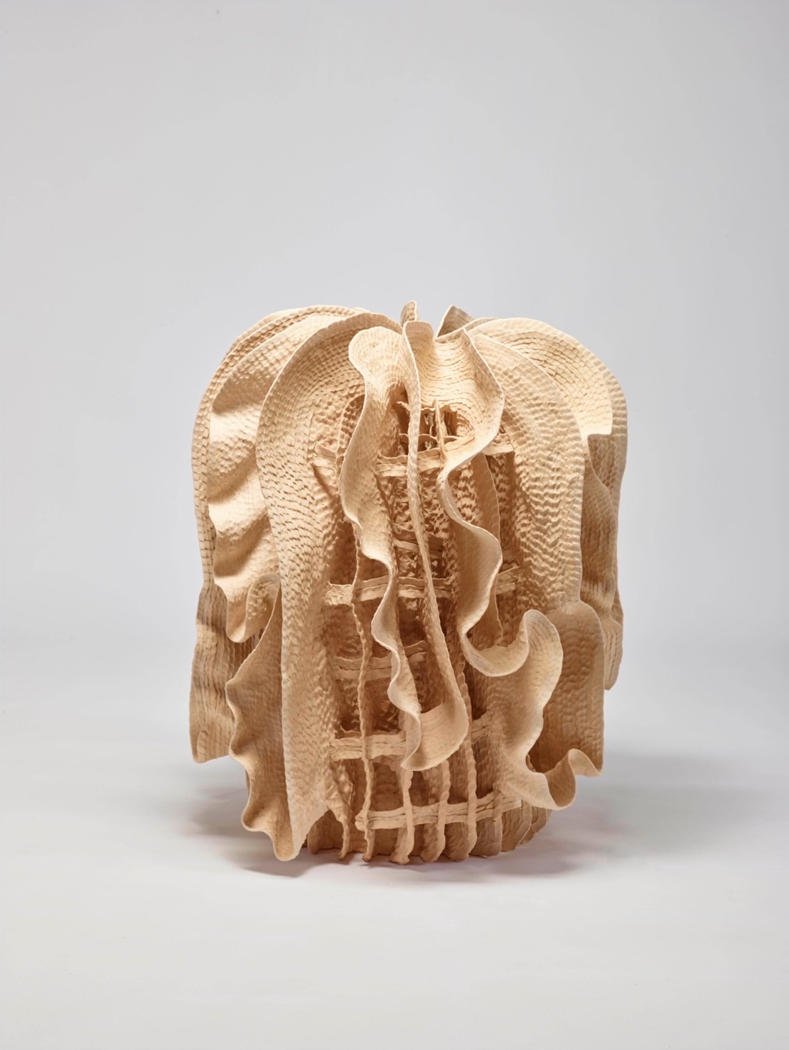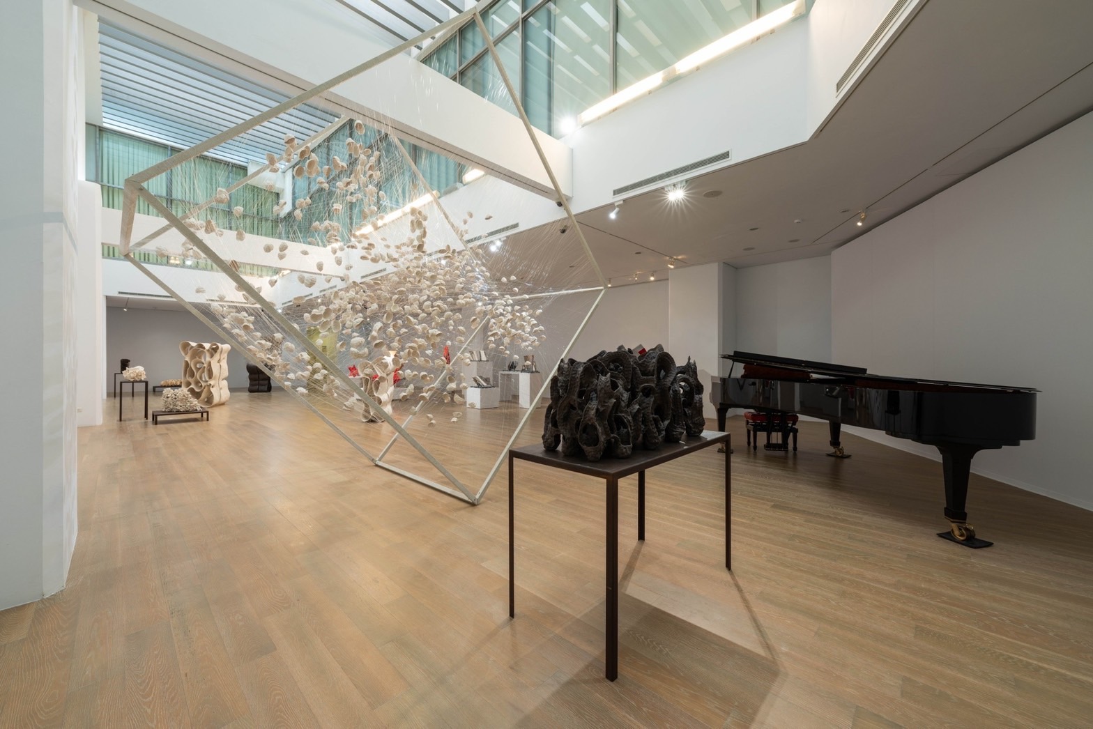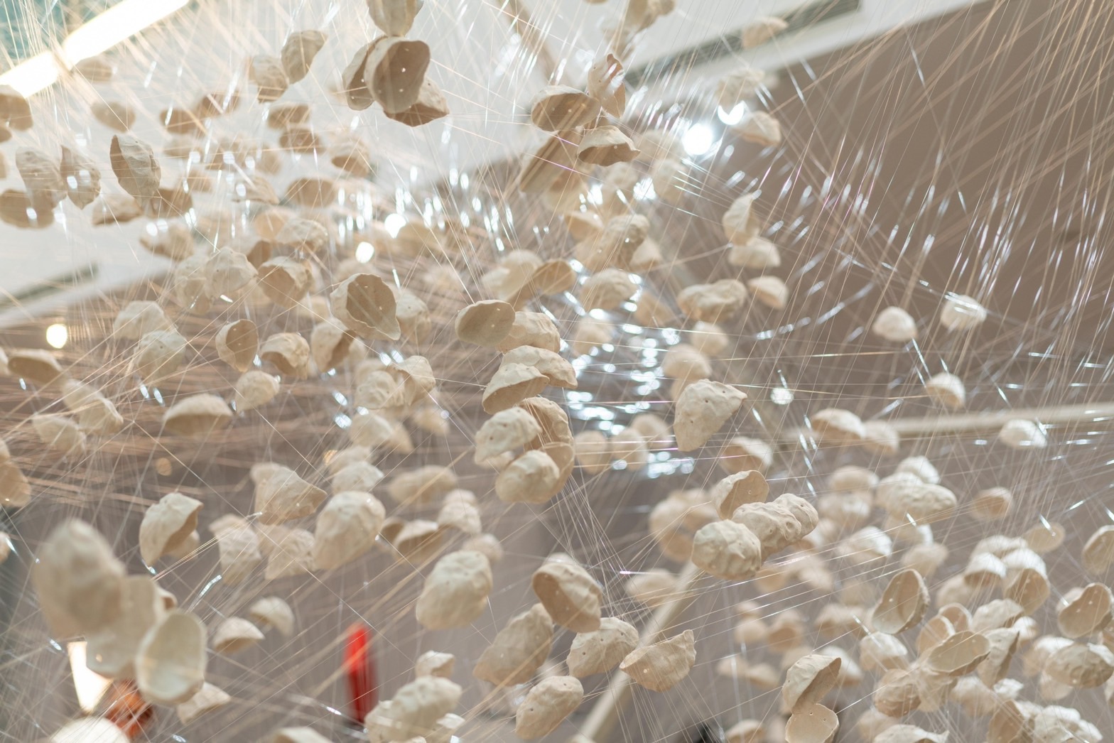 徐永旭的創作是體力極限的試煉和意志力的拚搏。他的陶塑是經由按、壓、擠、捏、搓等技法,將陶土製成枝條、海藻或鳥巢等天然形狀,重複堆疊而成。他說:「曾經我追求哲學上的應證,但後來我去除這些知識,回歸生物的原始狀態,像是蜜蜂築巢或蜘蛛織網一般,本能地面對創作 。」徐永旭將身體勞動灌注製作過程,指掌間泥土雜揉指紋、汗水,自然增生出繁複孔洞、曲線、溝痕的作品,像是藤壺聚合體,也像是深海礁石。《2022-53a》(2022)是一座參天的立方體,近千條透明線勾纏700多個小缽,宛若沾滿夢的超現實織網。二米多高的《2020-22》(2020),光在起伏的紋理之間穿梭、駐留,藝術家雙手留下的無數痕跡,透出濃烈而親密的生命氣息。