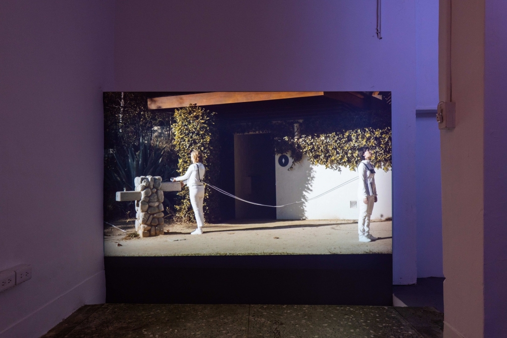 另一件錄像作品《這馬佇遮》(tsit má tī tsia)則由兩人背對背以鐵桿隔出12英呎的距離,此為美國疾管署建議保持的社交距離之兩倍,其概念取自瑪莉娜.阿布拉莫維奇(Marina Abramović)和烏雷(Ulay)的《Relation in Space》和《Relation in Time》(1977),以及謝德慶和琳達.莫塔諾(Linda Montano)的《Rope Piece》(1984)行為藝術。相互連結的兩人在都市空間裡長達6小時的行走過程中,僅憑手機前鏡頭的視覺線索以及鐵桿傳來的阻力/助力來理解對方的狀況與動向並予以配合;不同於個人慣常的行走節奏,在摸索空間以及人與人之間無聲互動的調適過程中,產生全新的感知體驗。
