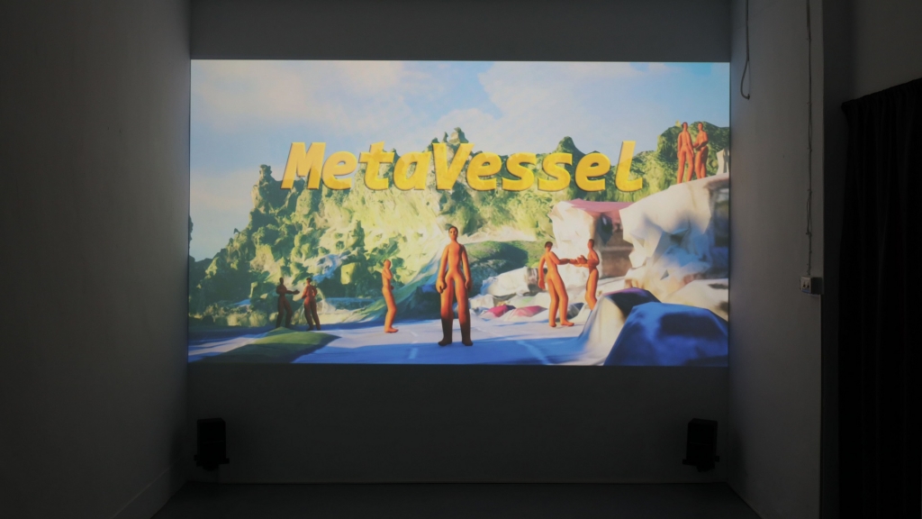 蔡宇瀟的另一部動畫作品《元方舟》(MetaVessel )也同樣探及當前熱議的元宇宙議題,在此活用《聖經》當中的諾亞方舟與洪水情節,敘述在一場被預知的大洪水OpenSea爆發之前,主角爭取登上方舟、進入元宇宙保身的競爭與培訓過程。作為登舟憑證的MetaMask狐狸面具、喊著「AII in the MataVessel」的Doge狗頭氣球等設計亦都充斥網路迷因元素。而在登舟前需進行鼻咽拭子採檢,結果顯示的「Postive」意指他們積極響應元宇宙時代的號召;然而,也可解讀為在現實中染疫的陽性反應,在疫情時代可能會因此遭受他人側目甚或排擠、驅離,而成為亟欲逃脫現況的推力。危機意識使人類在抉擇虛擬世界與真實生活之間產生相互推引,如何取得平衡也成為如今難解的議題。