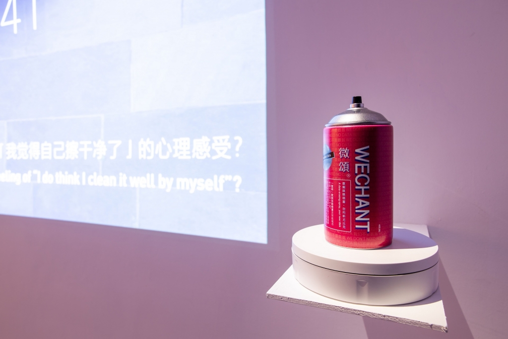 蔡宇瀟居住在積極打造智慧城市系統的杭州,加上近年大流行時代造成的線上、線下生活模式改變,驅使他將這些身體感知融入創作之中,以黑色幽默帶出對現實的反諷與反思。《微頌》以仿廣告的內容推銷一款名為微頌(WeChant)的噴劑,其命名靈感來源於中國最大的社交媒體平臺微信(WeChat),其概念是對美國科幻小說家菲利浦.狄克(Philip K. Dick,1928-1982)經典作品《尤比克》(Ubik)的致敬。微頌噴出的微粒為莊子《逍遙遊》:「若夫乘天地之正,而御六氣之辯,以游無窮者,彼且惡乎待哉。」的字句,能夠消除一小時的數位足跡,而此種「以數據換數據」的數據抹除手段,亦是在隱秘地傳達藝術家對「微頌」噴霧本身的不信任:既然智慧城市和微頌噴霧都是基於對人類數據的把握,那麼微頌所宣揚的美好生活狀態,何嘗不是一種「智慧城市式」的廣告?建構智慧網絡所需的數據也使人們的一切都有跡可循,為享受便捷生活而犧牲個人隱私的代價是否值得,造就這件作品頌揚/鼓吹不想被窺伺的反抗理念,讓人期待未來生活的美好之餘也對體制產生更深層的思考。