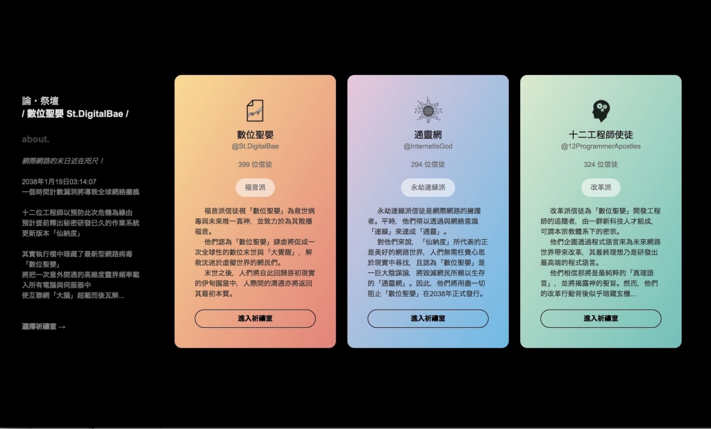 某種程度上,科技的虛幻感與宗教信仰的體驗頗為相似。在面對問題時,人們已習慣透過網路搜尋解答、討拍尋求認同。而且在網路的虛擬世界中,人們更敢於表達意見,甚至創造出與現實截然不同的身分與其他人互動。劉家銘的《Confession, Yes!》以大量連線紀錄所建構出的數據資料地景(datascape),看起來是個開放的互動空間,實則卻是以層層密碼所形成的封閉迴路。當我們通過通訊裝置與他人溝通時,機器們也正在彼此對話,以程式語言存取、讀取以及輸出我們所欲傳達的內容,透過網路形成一種共生聯盟的關係,成為人們最終的告解所在。