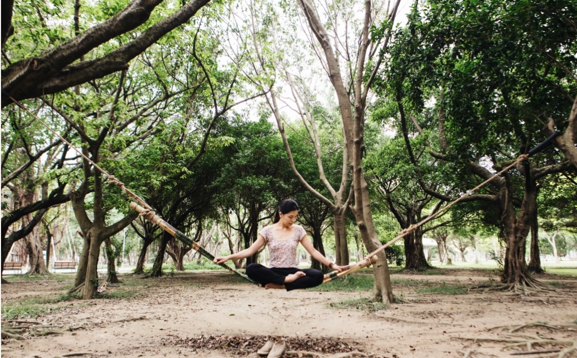 步出大安森林公園站的光塔,森林宛若一條深邃的甬道,語焉不詳、曖昧的地圖指引,僅能聽從感知的召喚去尋覓。穿過隔絕城市房籠、車水嗡絮的整片森林,傳來的是,層疊弦樂築構的廣闊空間感,優雅靜謐,人們棲息於樹距間的吊床,搖晃閉目,懸垂於枝林間啜飲一杯茶湯,白布是茶室的天與地,樹影下緩速進行的瑜珈,他們說,「這是一場慶生。」