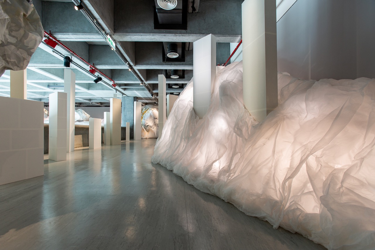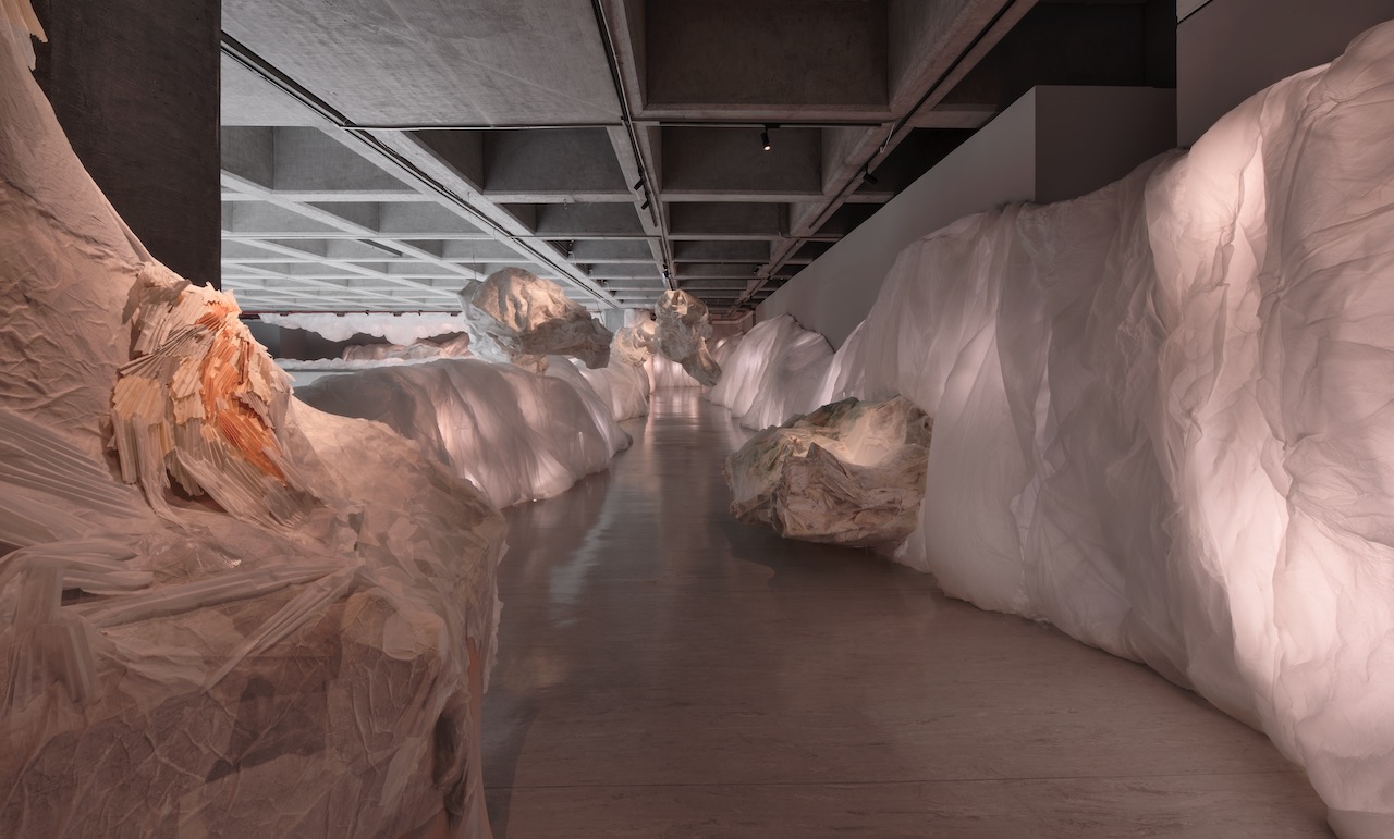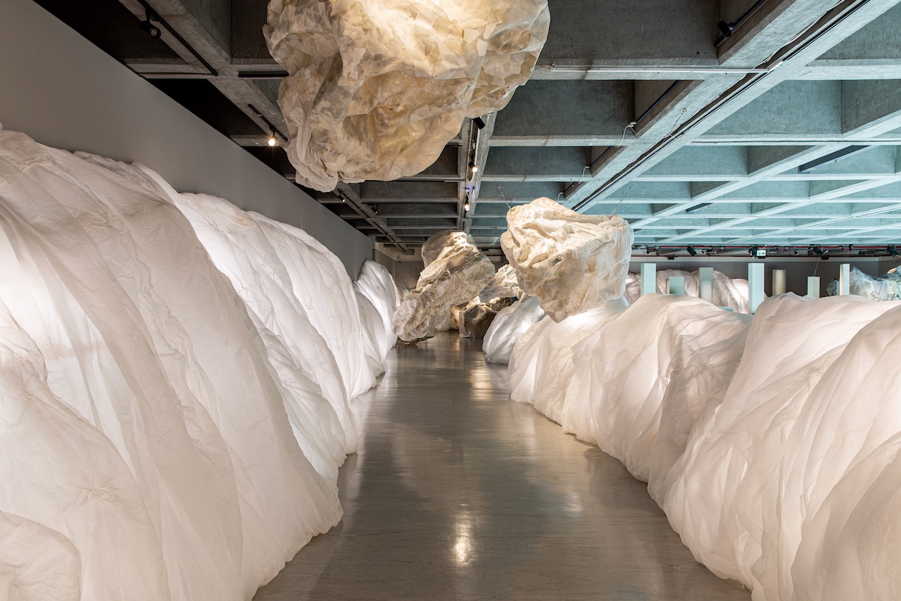 在第一個展區設置經過裝裱加工的長柱體,對應山壁自然皺褶的狀態,除了凸顯文明與自然的二元關係外,實則也寄託了鳳嬌催化室對於「當代」藝術,與保存修復這類「傳統」技藝彼此循環共生的期望。接續的「飄浮之境」展區,團隊將紙製岩石懸吊於展場中,營造巨石飄浮的奇異感,翻轉一般大眾對於輕與重的認知,並點出「單向思考」的侷限:既定觀念中沉重危險的岩石,若用紙去製作也能輕盈無害。而全區燈光設計也貫徹了光影相依、二元共存的概念,江佶洋採用內部投光的方式,在紙張塑形前先安裝照明裝置,經過不斷微調修正,讓光線透出紙張時,能不顯露內部結構的陰影,聚焦呈現紙張經過揉皺、撕摺後的質地與紋理。整體燈光也因應館內自然光的日夜變化,設定了兩種會自動調整燈光色溫與亮度的照明模式。