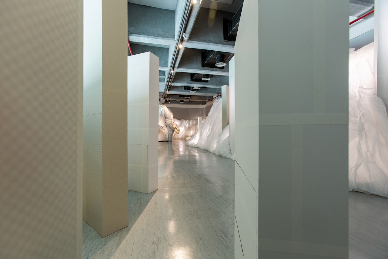 本次「崎」的展場分為三個主題,依序是「山徑」、「飄浮之境」與「流光」。走入「山徑」,迎面即是右側高聳連綿的山壁,皺摺紙面透出迤邐光影,指引觀者前行;左側則是幾個作工精細、高下相間的長柱體兀自豎立,順著打在柱上的燈光近看,會發現長柱表面紙張在裝裱時,由右至左、從上到下相互拼貼所裸露的銜接邊線。此時,觀者可能會納悶,為何在有機的線條之中會冒出富含秩序感的長柱?其上露出的邊又是什麼⋯⋯?而這些疑問正是李依耘希望帶給觀眾的。無論觀者因為置身於自然與文明並呈的二元環境,而在過程中產生了多少疑惑,重要的是最終回歸內心的感受——它們是不是依舊帶給你寧靜的感覺、並無二致?