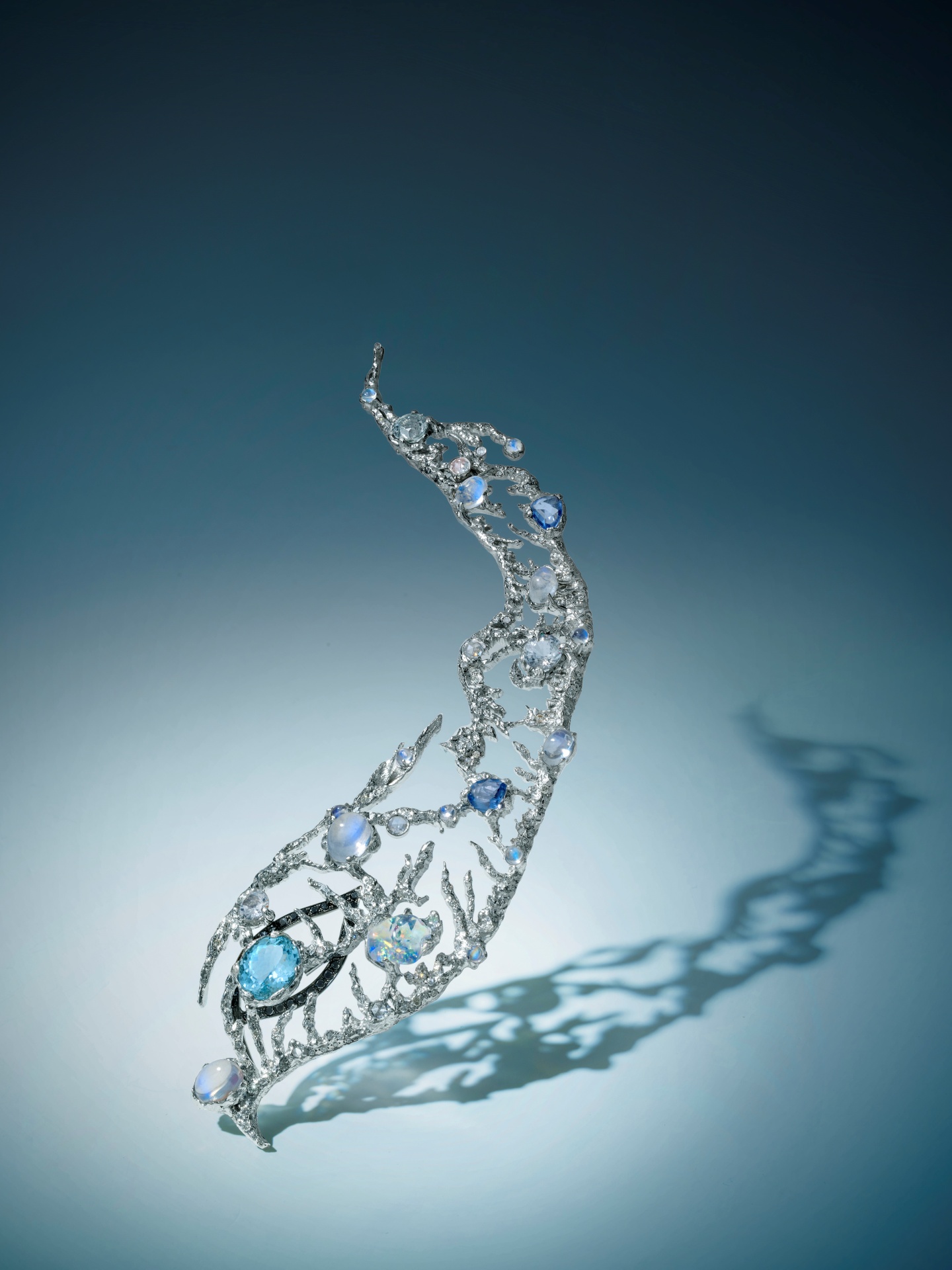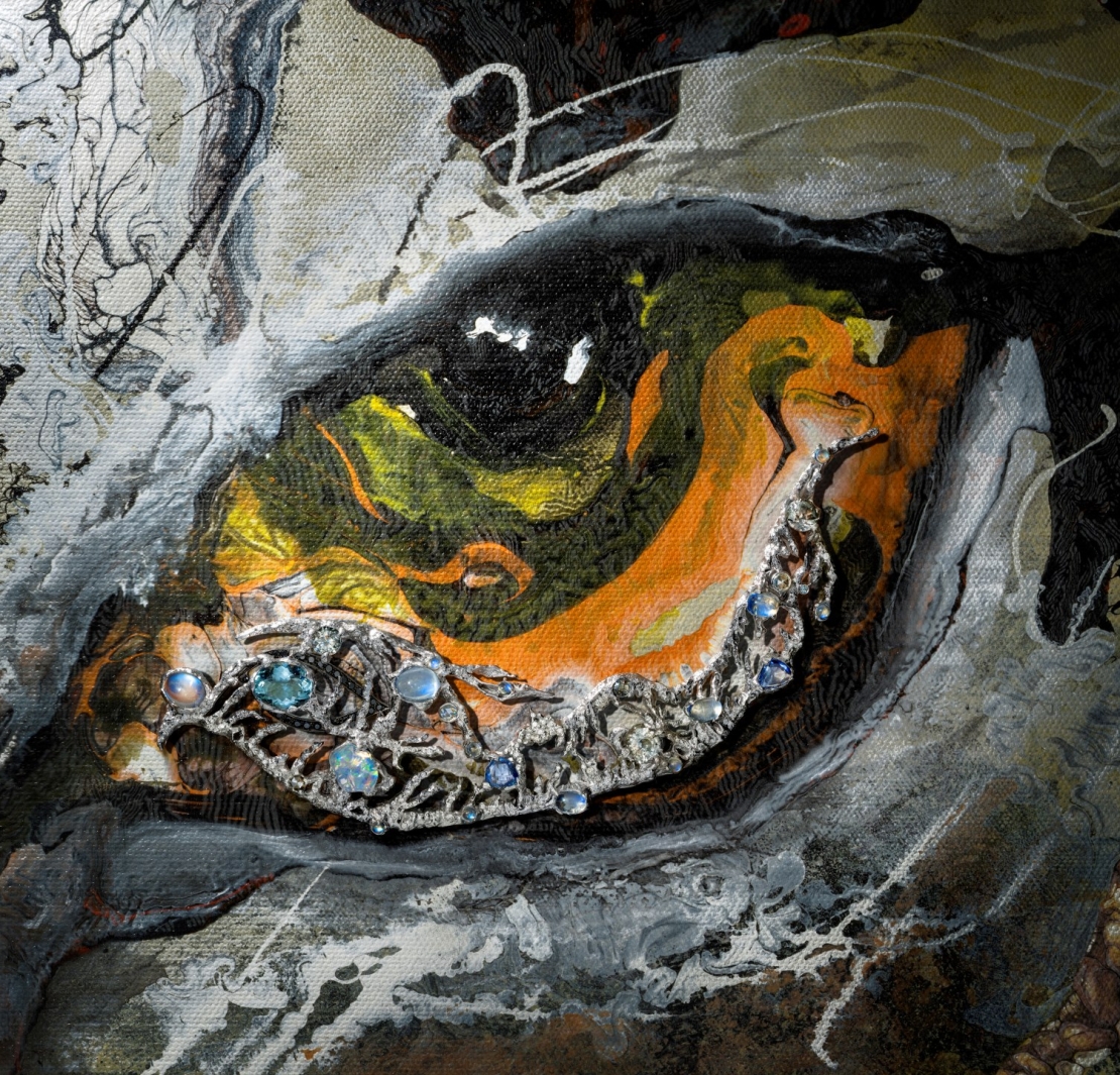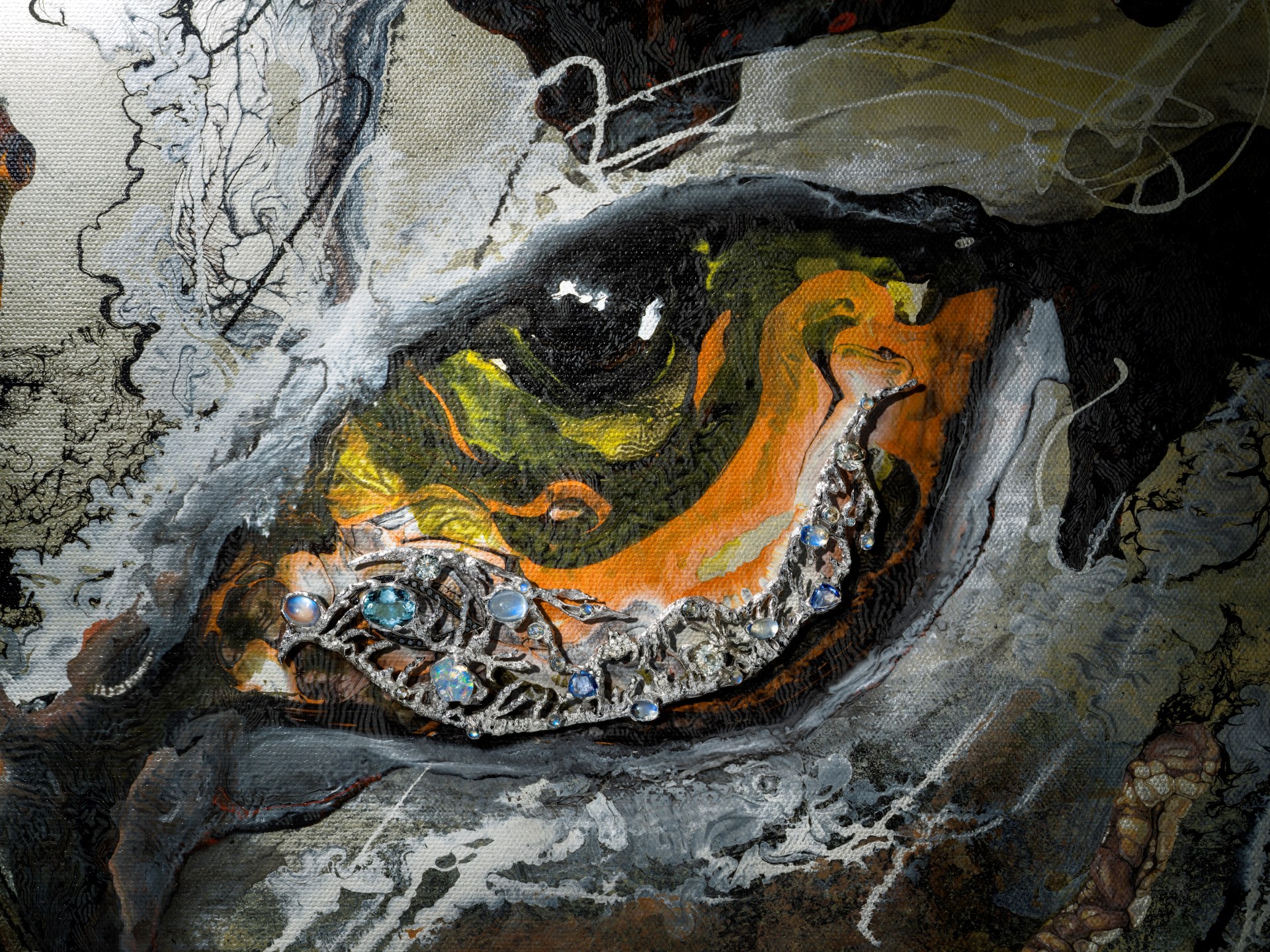 除此之外,「神畫」有更多跨界與突破,蔣友柏特邀藝術家SHEE參與創作。SHEE挑選了「神畫」系列的《The Beginning》、《Two Sides of a World》、《Starry Night》三幅畫作,為其設計對應珠寶,並將珠寶與畫作結合:絢麗迷人的火蛋白石與鑽石是龍的眼睛,海藍寶、碧璽、石榴石、月光石交錯成了虎的眼影,紅寶石、黑鑽石、白鑽石、金與銀則繞成了貓頸上風采。每件珠寶作品皆以愛情故事為主軸,這些故事,是SHEE對於愛恨情仇的詮釋。關於美與愛,兩位藝術家帶著各自的體悟,在潛意識中對話、在實體作品中產生交集,畫作自此有了平面以外的延伸。