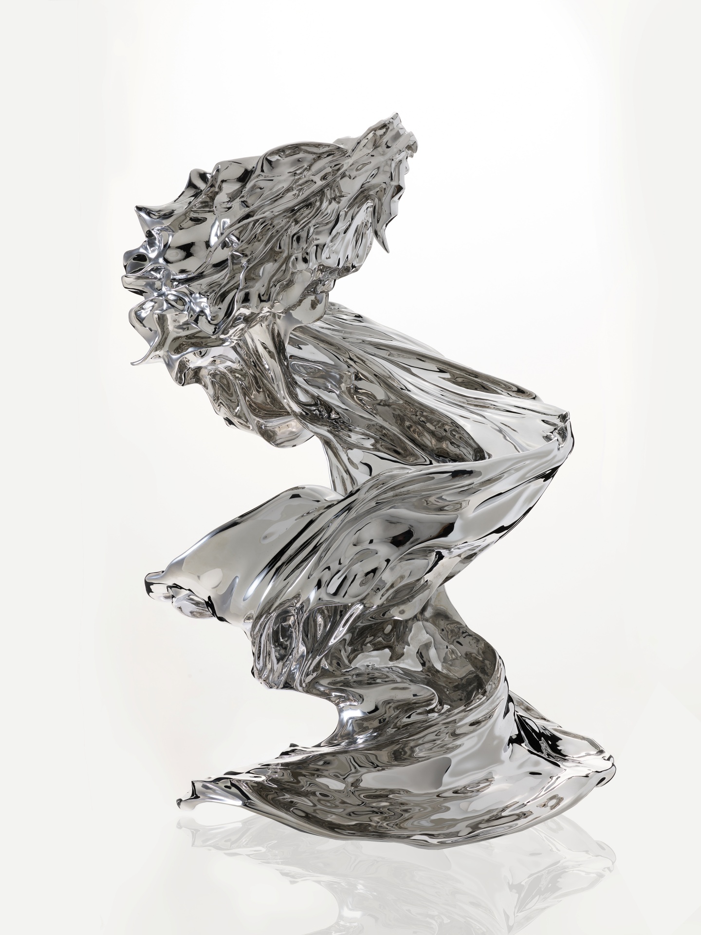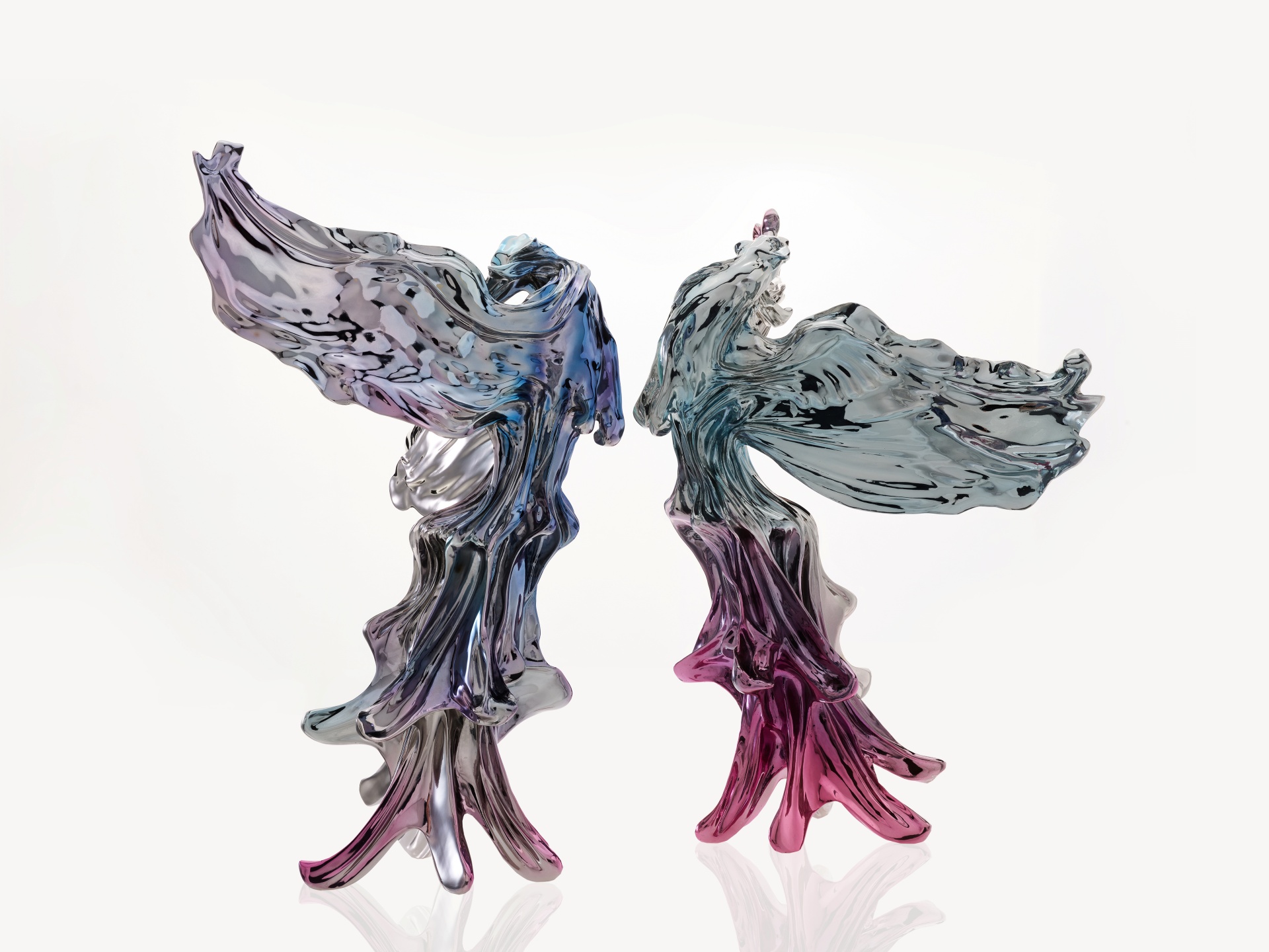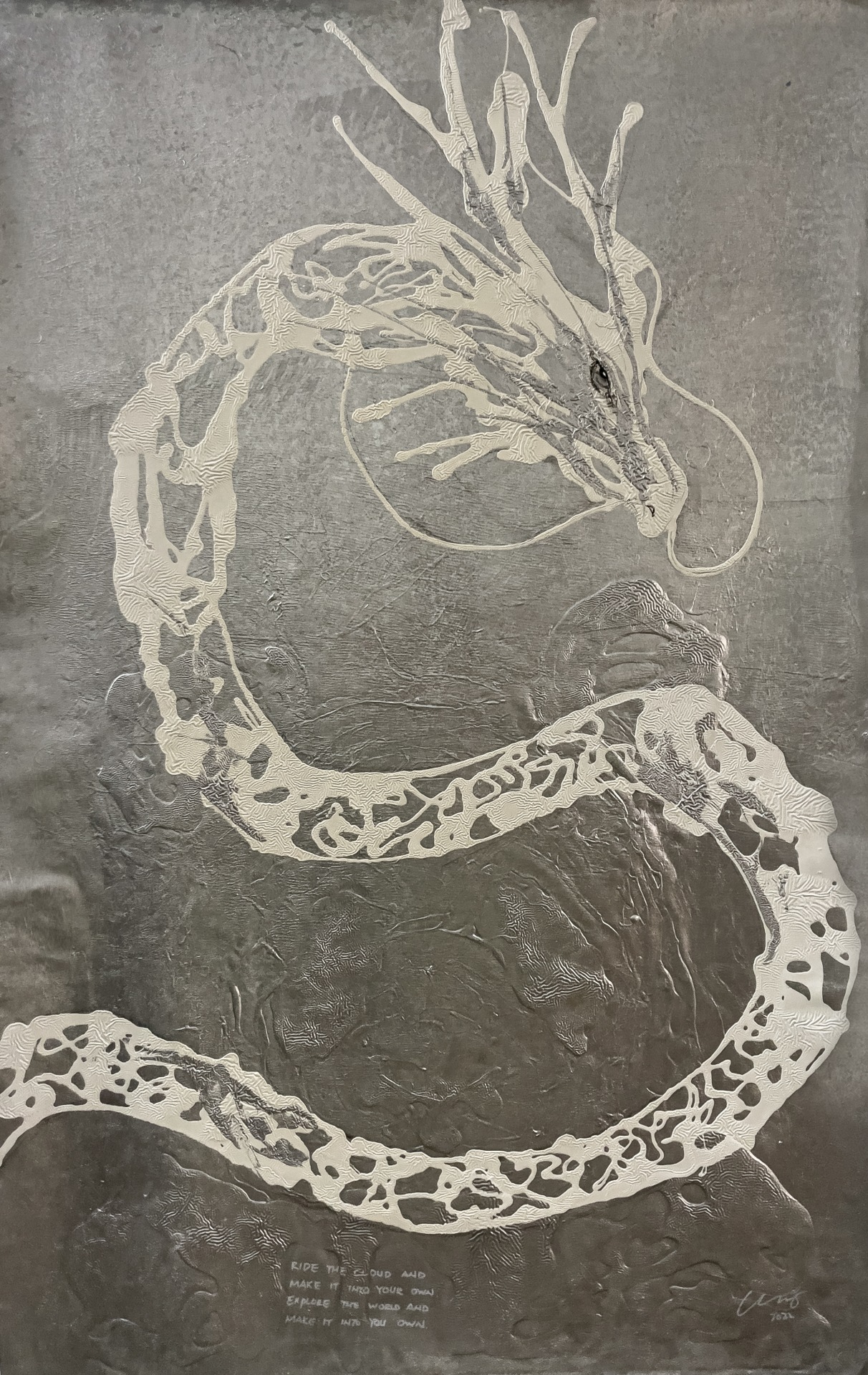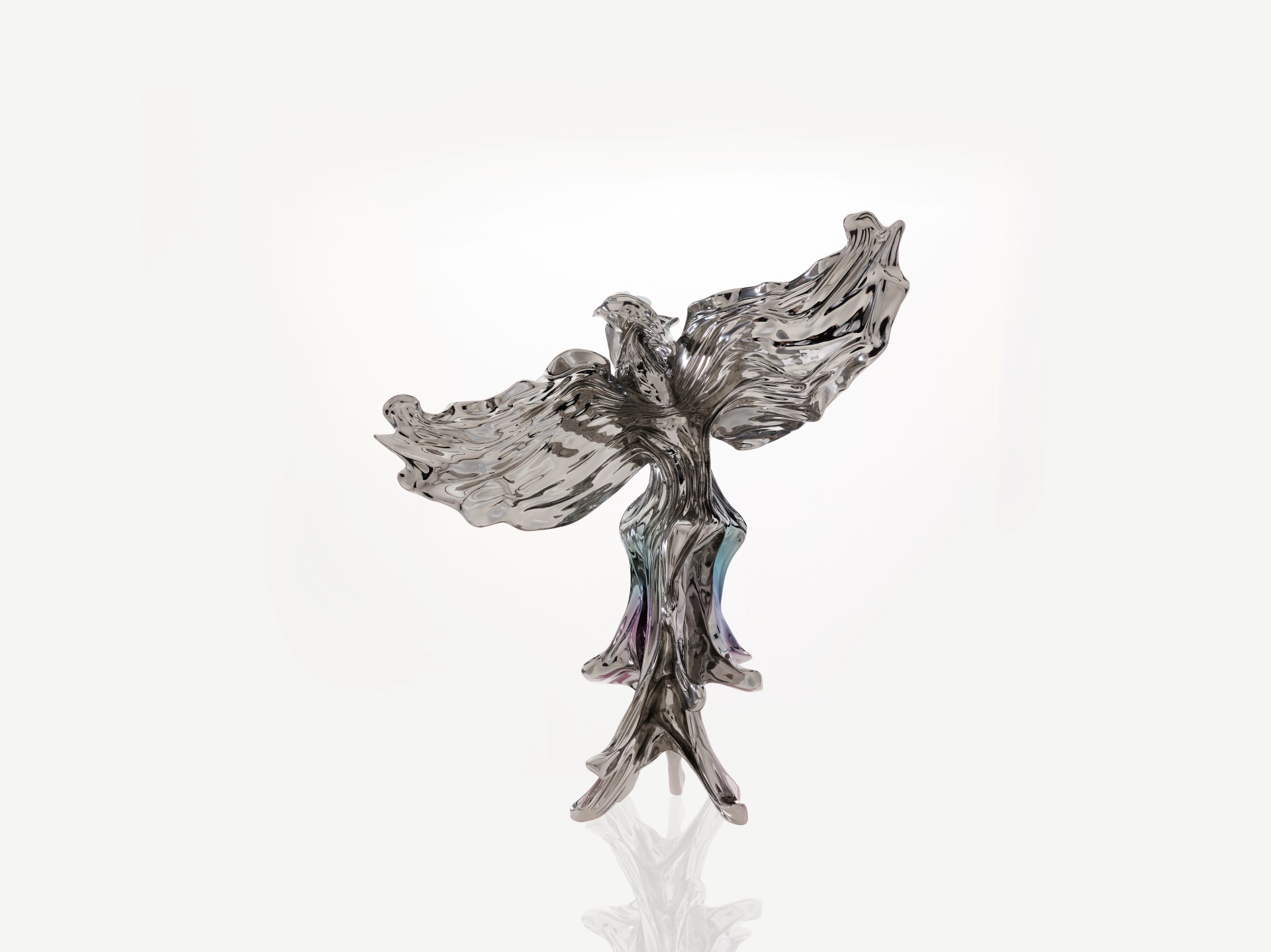 至於雕塑,先前蔣友柏透過豹的形象,探討真空、核心、時間、空間的議題與其在動靜之中生生不息的守護。這次則自真空中破繭,在神話故事的背景之中,以龍和鳳的樣貌登場。《Dragon Leaps》與《Phoenix Dance》兩者尚保留了一點被真空彌封的邊界,同時展現更多的是破繭瞬間的動態定格,以及藝術家內心騰躍與湧動的自由心境。