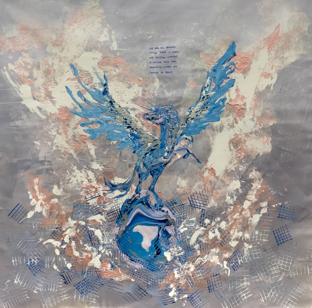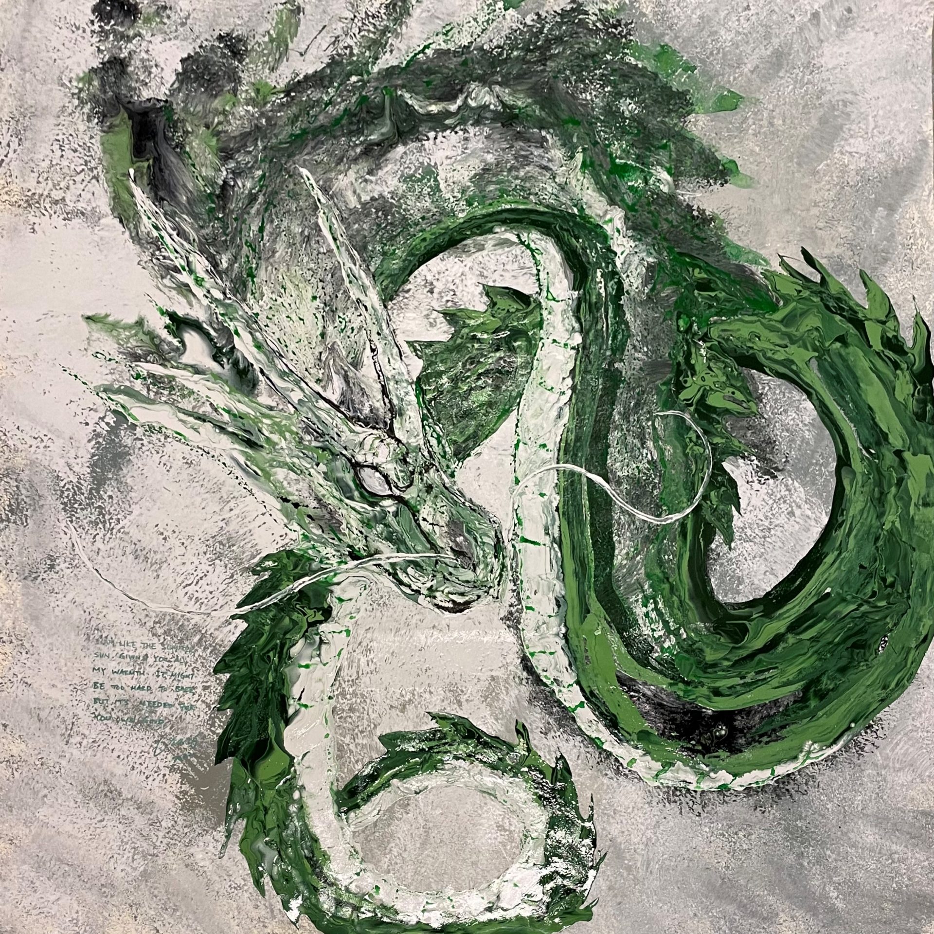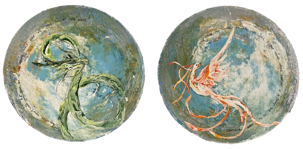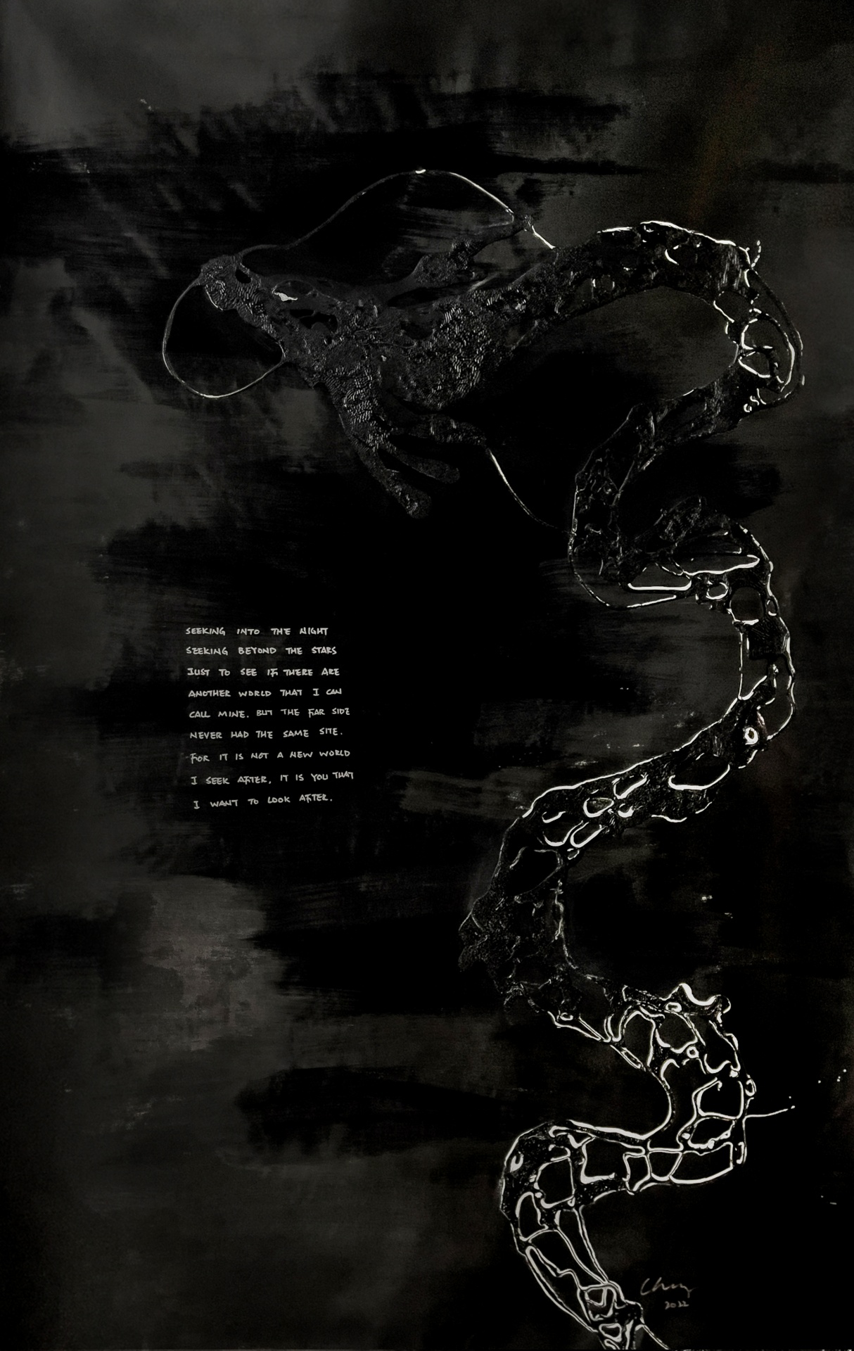 至於雕塑,先前蔣友柏透過豹的形象,探討真空、核心、時間、空間的議題與其在動靜之中生生不息的守護。這次則自真空中破繭,在神話故事的背景之中,以龍和鳳的樣貌登場。《Dragon Leaps》與《Phoenix Dance》兩者尚保留了一點被真空彌封的邊界,同時展現更多的是破繭瞬間的動態定格,以及藝術家內心騰躍與湧動的自由心境。
