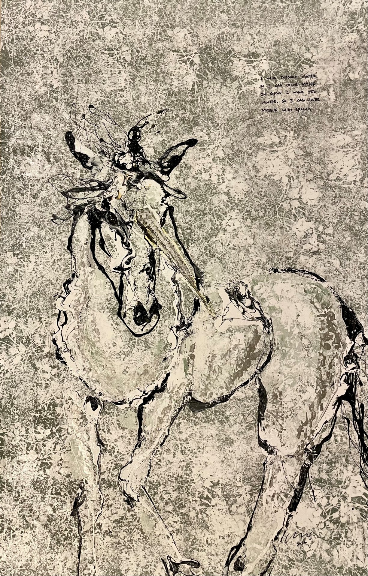 2022年,蔣友柏開始創作「山水動物」系列,摒棄傳統畫具,以懸空揮動的手勢技法,透過直接滴淋、潑灑、塗刷,將漆料與水面融合堆疊,形成不同層次的肌理,看似抽象,卻有山水遠近的景深,同時又將動物型體輪廓勾勒出來,讓觀者感受到畫中的動物從流動的線條中幻化而出,有如這些擁有力量的形狀、顏色、形式和姿態在點上眼睛後,動物瞬間從無際的山水空間中一躍而出。