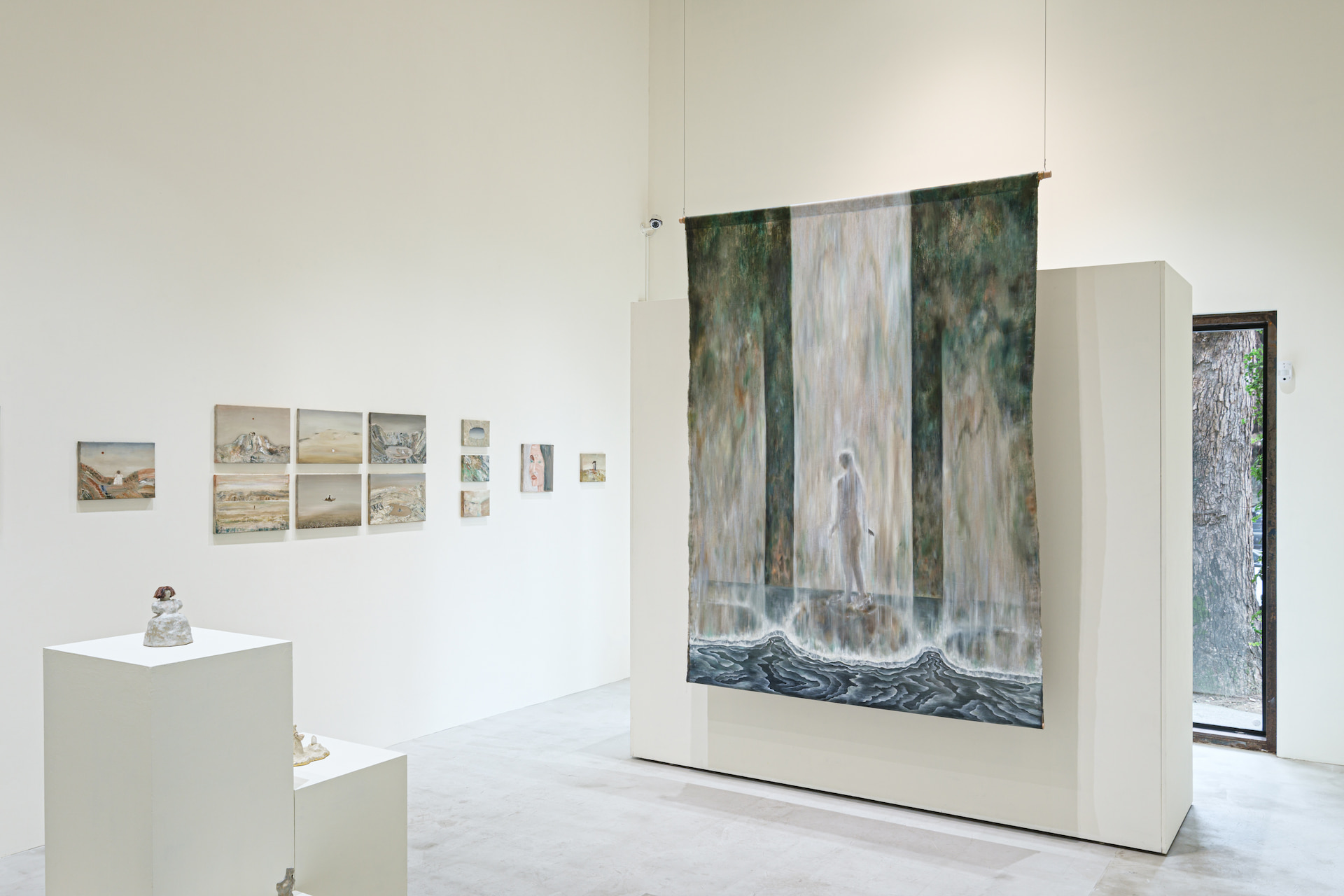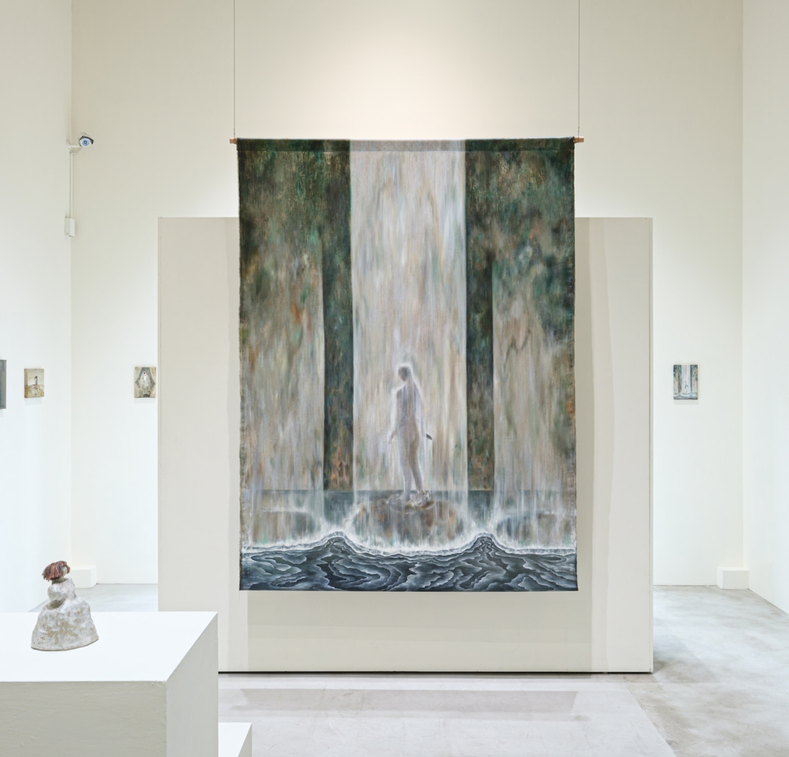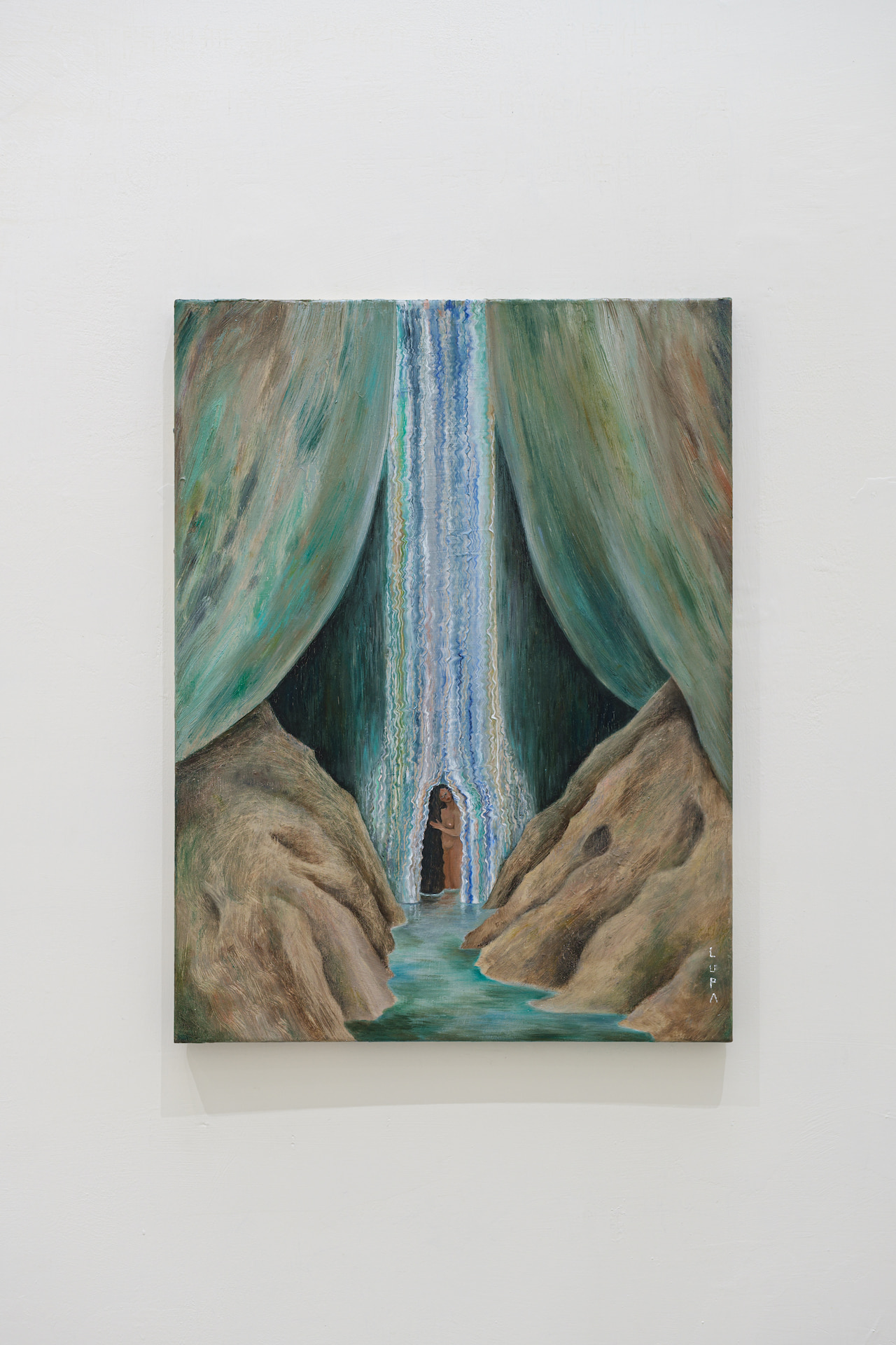 這也是為什麼,《波瑟芬妮》的構圖是在這次個展中的瀑布系列裡,是較為特別的存在。傾瀉的瀑布因使用較為濃厚的顏料,看起來更像是以某種頻率顫動而下的清亮能量。在如舞台般的洞穴裡,佇立於中間的波瑟芬妮並沒有被瀑布的力量所覆蓋,而是將其一分為二。接受著力量、撫慰著自己的長髮,一邊梳洗,一邊像是正要從中走出來。