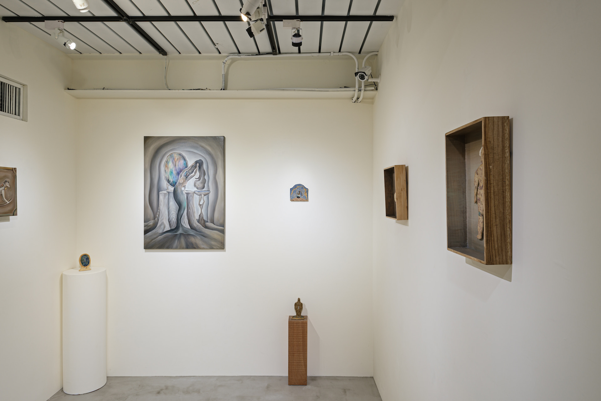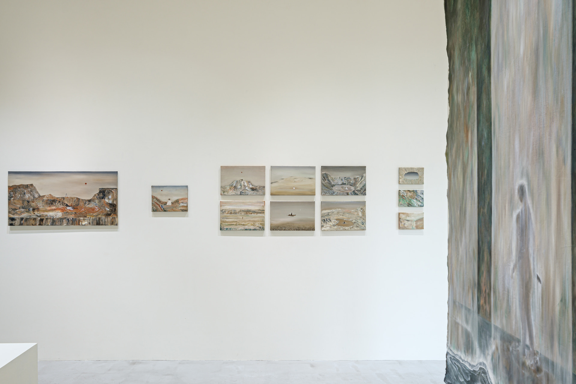 LUPA塗繪人物的方式,與建構抽象表現式的岩脈之間,藉著兩種繪畫的手法構築了不同世界的交會,因而使人物在畫面中看起來像是外於這個世界的、格格不入的一份子。在展示著小尺寸畫作的展牆上,有多件作品均以此方法營造孤寂感。圖為Crystal Lupa個展「人間勿語」展場。(Hiro Hiro Art Space提供)