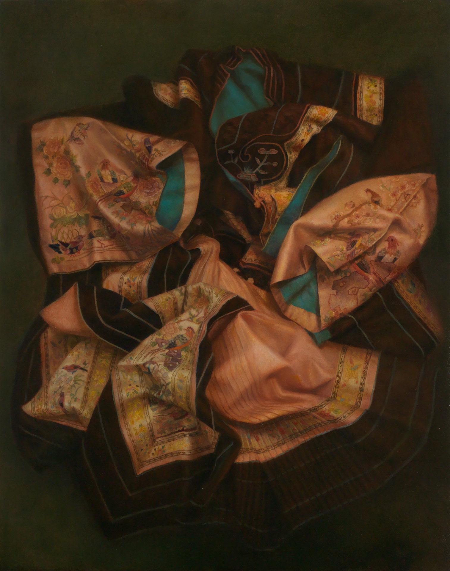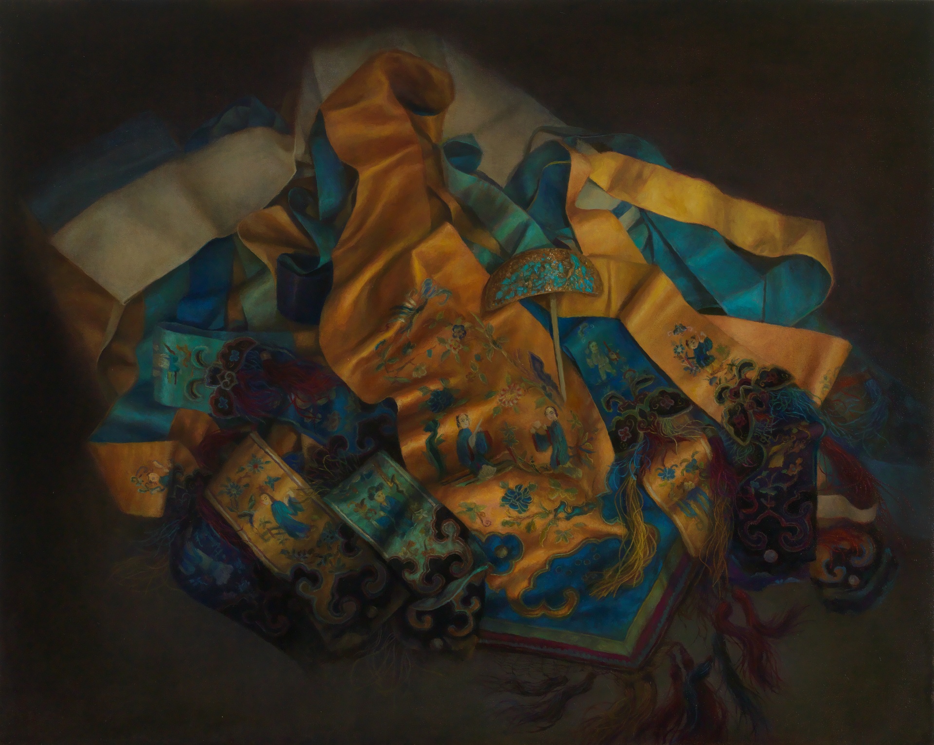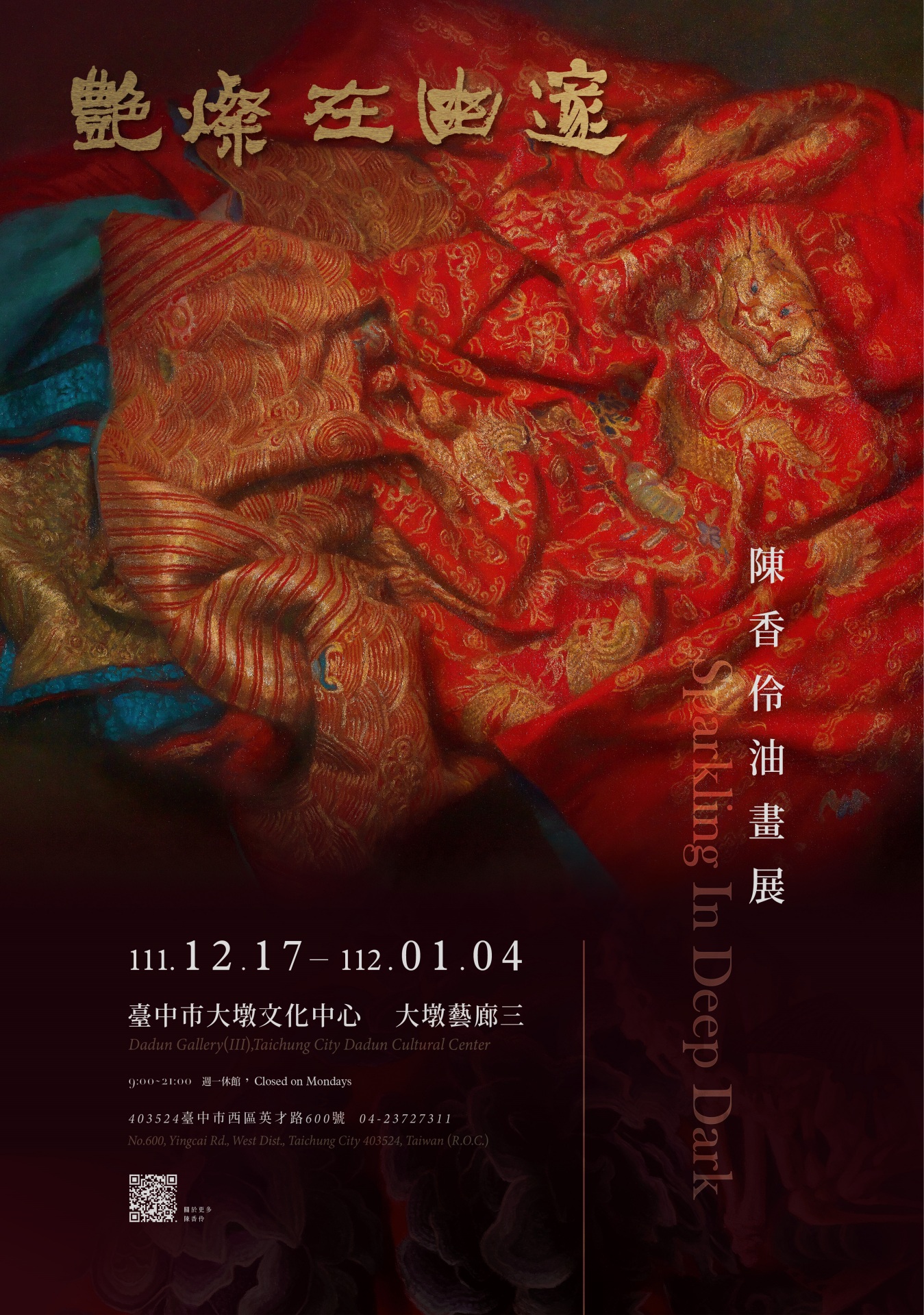 正如策展人徐婉禎為展覽訂定的主題「艷燦在幽邃」,我們承載著苦難在人世間迎風而行,總是在磨難中焠鍊出生命的韌性,繡面隨著畫布的褶皺,猶如人生的跌宕起伏。「在涅貴不緇,曖曖內含光」,我希望我的畫作是有溫度的,寫實繪畫對我的創作而言並非技巧的耍弄,而是必要的存在,因為在油彩層疊罩染之間,猶如苦行僧的自我修練,忍受耗費體力與眼力的繁冗進程,生命的強韌卻也因此而厚實,我也得以自我救贖與療癒。婉禎說我的畫作「長期以來,以其精緻細膩的筆觸,描繪出清朝古衣的典雅華麗。絲綢布料獨有的特殊質感,猶如珍珠、猶如翡翠,曖曖內含光,低調卻不失優雅地閃耀著光澤。畫筆也是繡針,密密繡畫的既是絲綢上斑斕的彩圖,也是跌宕曲折卻展現出精彩的人生。陳香伶身為女性,經歷了為人女、為人妻、為人母的人生階段,遭逢了生死離別及大小苦難,她在作品中繪出她自身經歷的昇華,只有在深沉的黑暗幽邃之中,才能盡現生命艷燦的光芒。」她的文字給了我力量,也是期許。