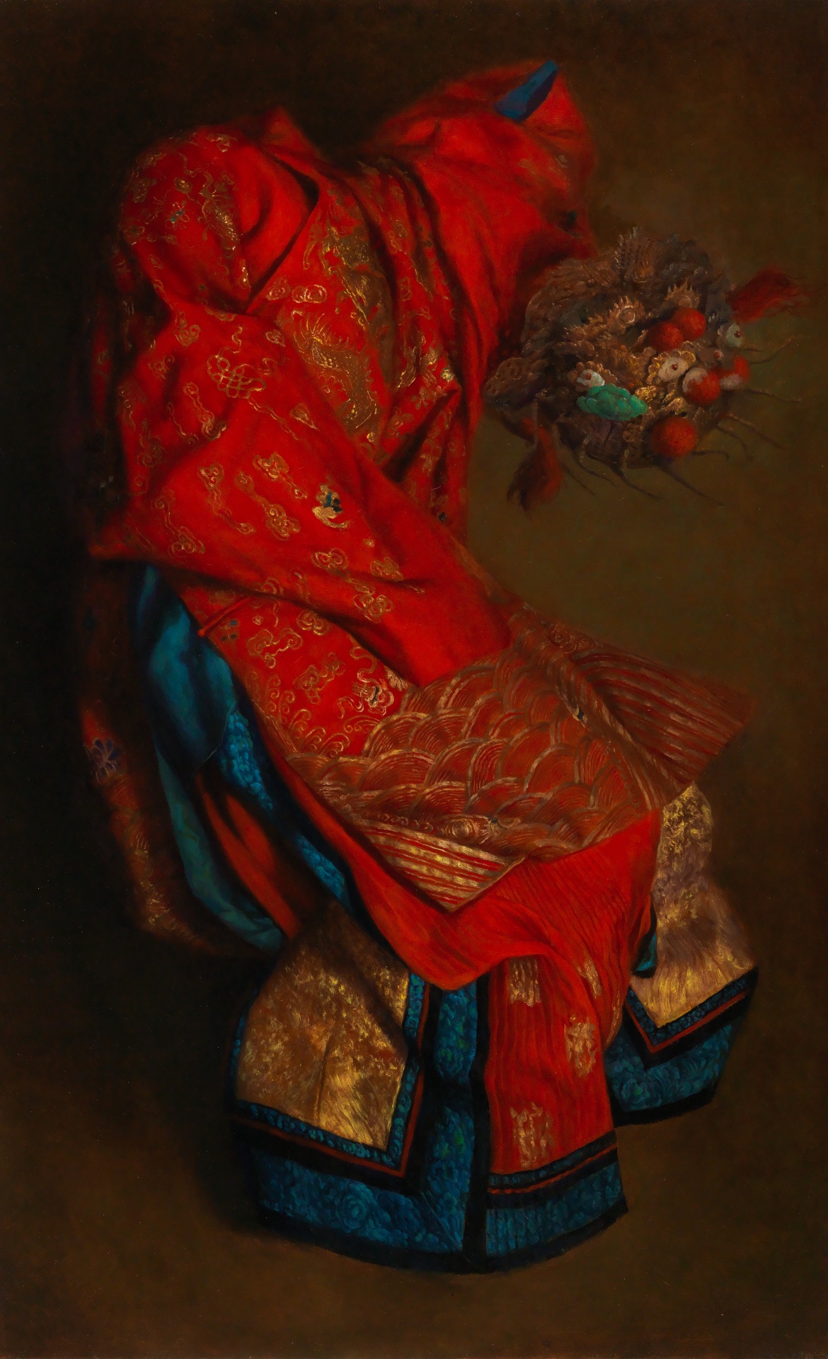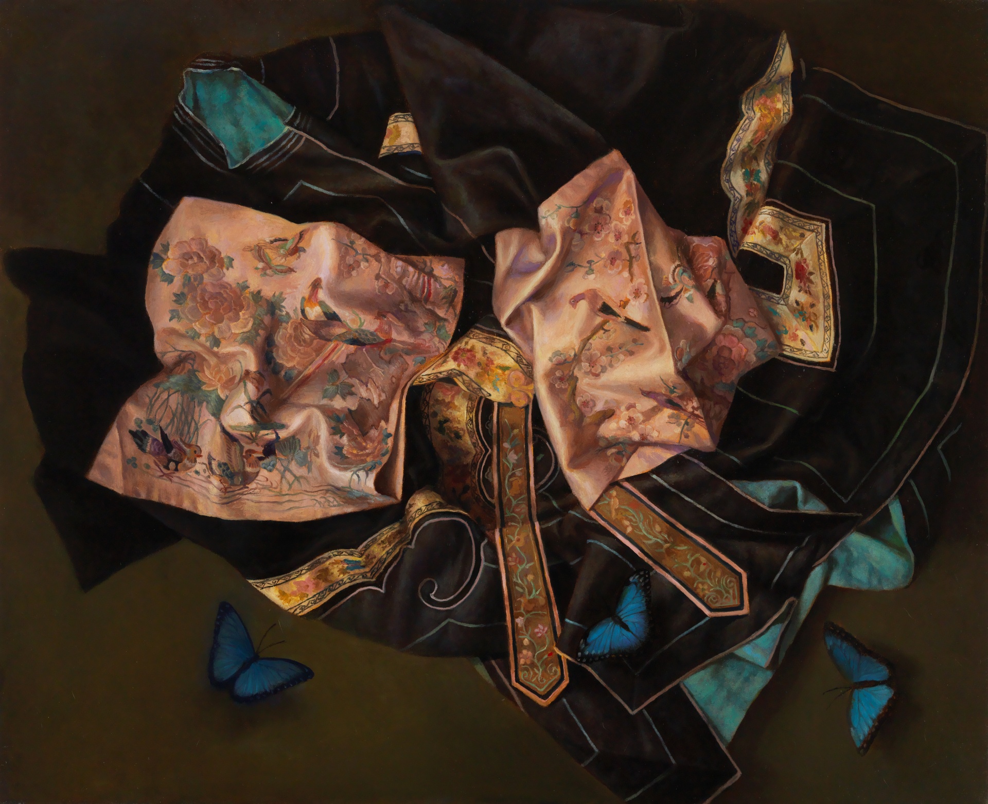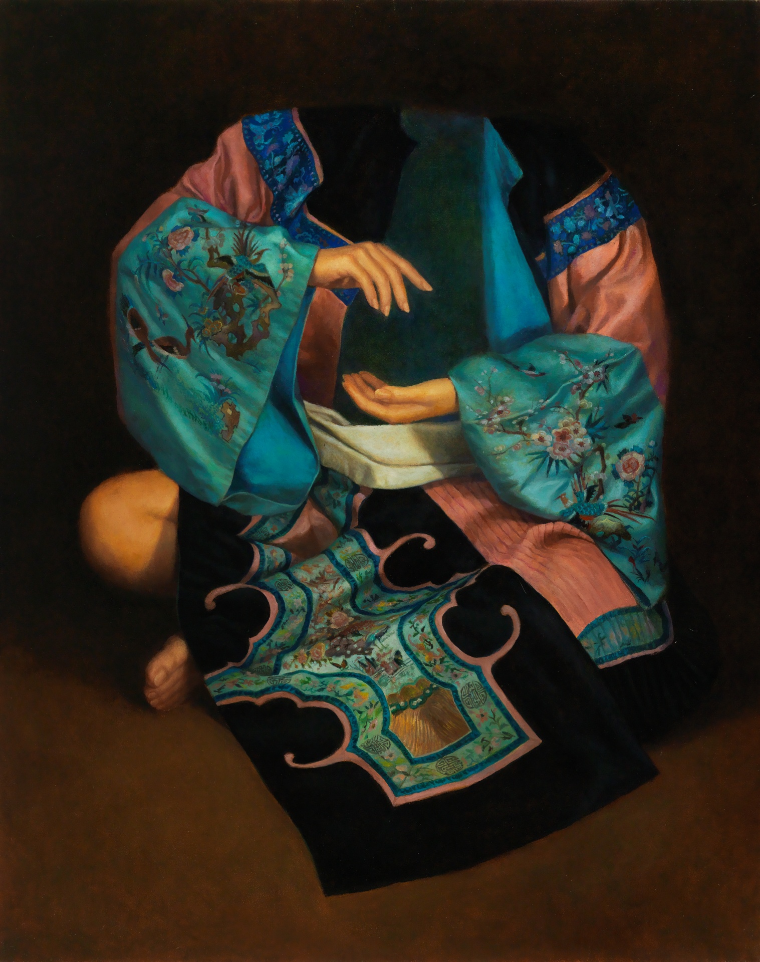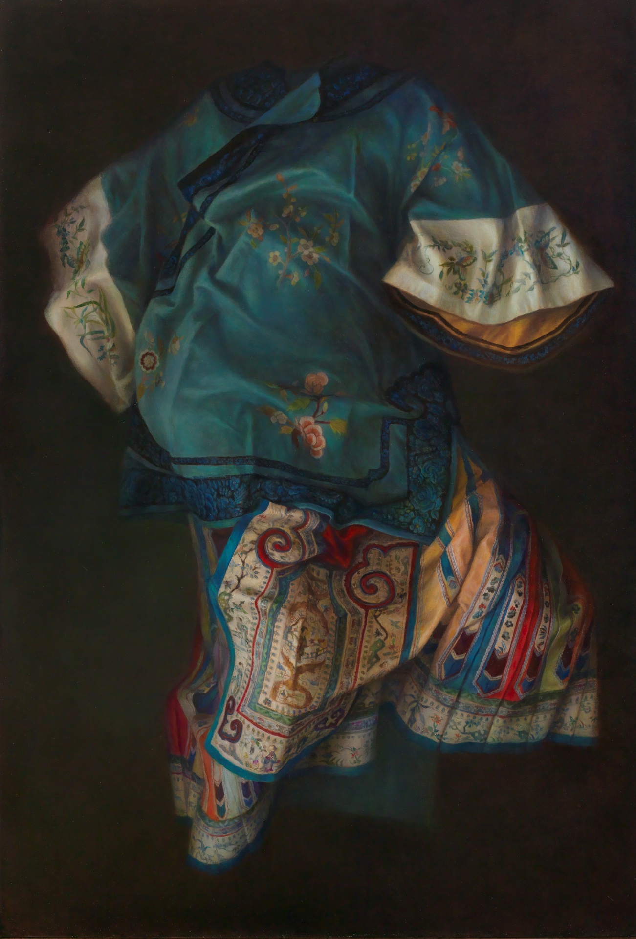 早期臺灣社會在「重男輕女」的觀念影響下,女性多遭受不公平對待,總是被迫去接受社會加諸其身上的差別待遇,被迫妥協於如此不堪的境遇。我以自己積累的生命經驗和多年以來對古老刺繡的執戀,敘說身處男性主宰威權體制下的女性自覺,藉由古典寫實油畫技法的層疊筆繪,揭露潛藏內心許久的壓抑,探索閨秀刺繡之於古代女性的寓意,以及現今女性存在的價值與自我覺察。滿繡花鳥圖飾的大襟衫和馬面裙,對家人的祈願祝福盡顯於費心縫製的精緻圖樣裡。古代女性奉獻畢生心力成就的美麗織繡,與我的生命軌跡如此相似,在筆繪細描之間,隱微著淡淡的哀愁。我彷彿化身古代繡女,以畫筆代替針黹,游移在布幔之間,繡縫出生命的悲喜,也觀照了自我。