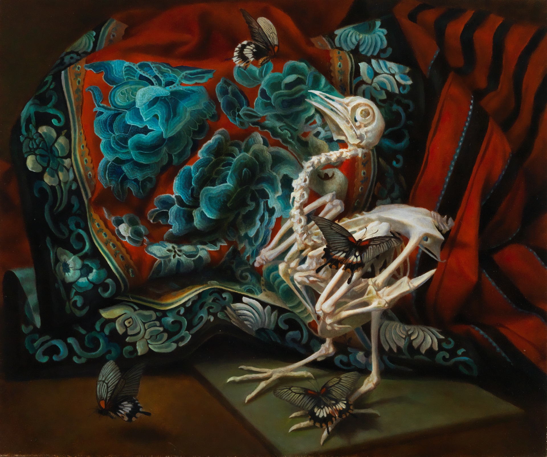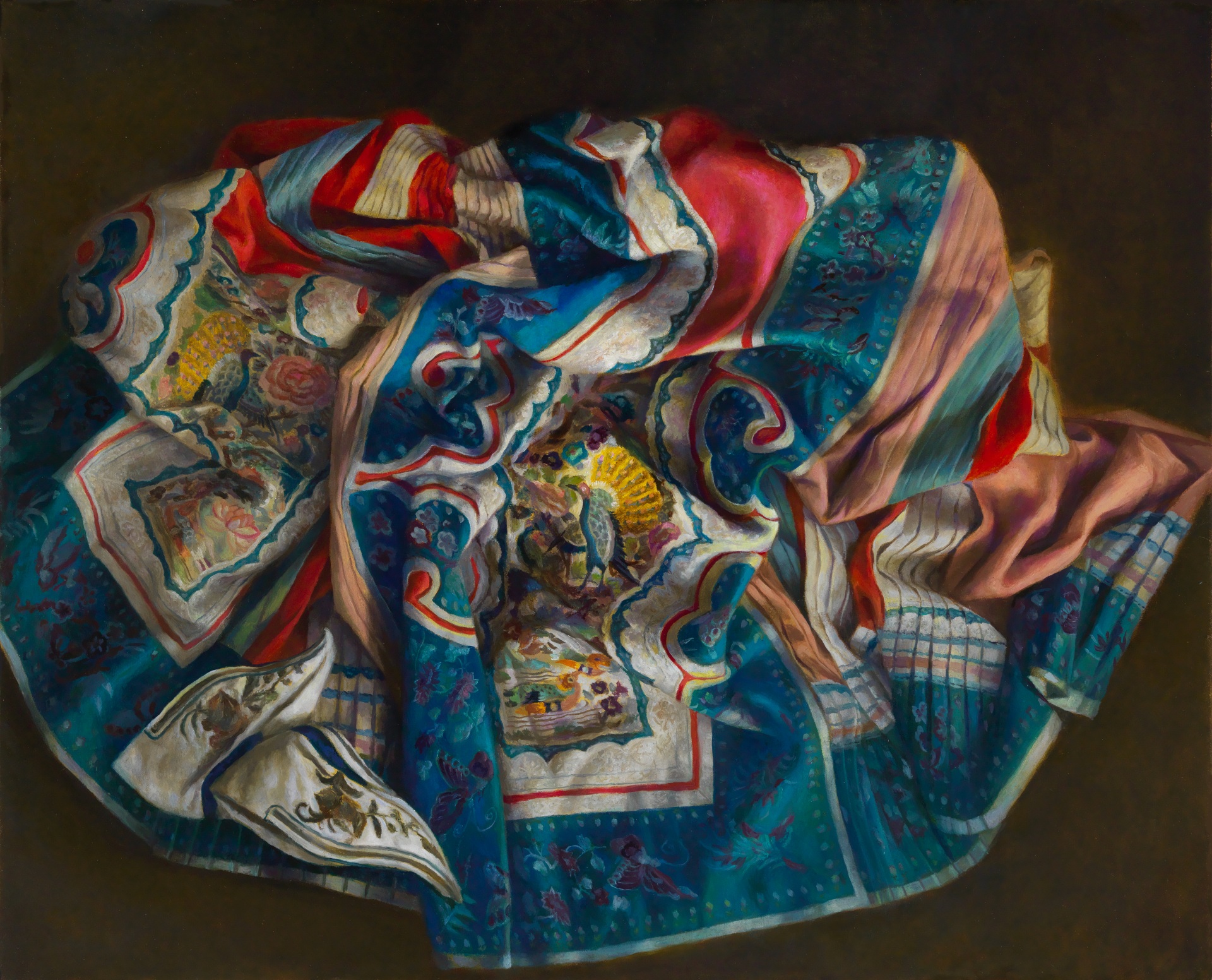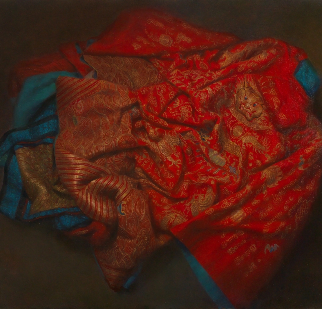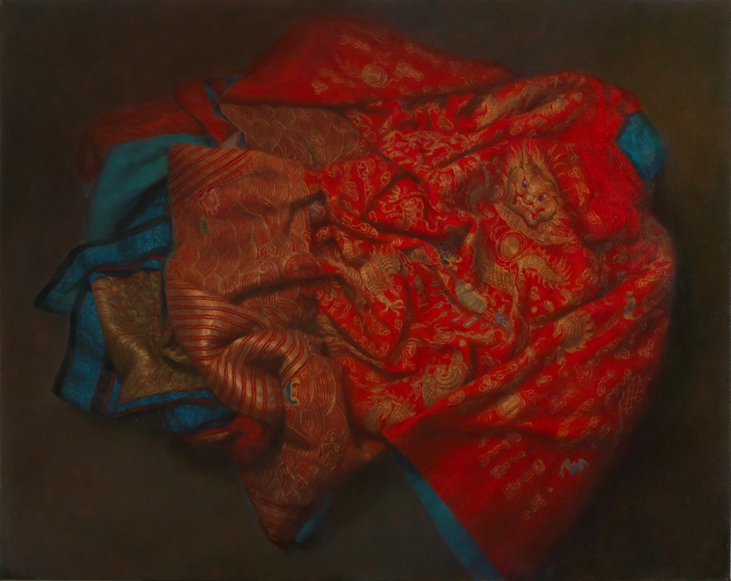 早期臺灣社會在「重男輕女」的觀念影響下,女性多遭受不公平對待,總是被迫去接受社會加諸其身上的差別待遇,被迫妥協於如此不堪的境遇。我以自己積累的生命經驗和多年以來對古老刺繡的執戀,敘說身處男性主宰威權體制下的女性自覺,藉由古典寫實油畫技法的層疊筆繪,揭露潛藏內心許久的壓抑,探索閨秀刺繡之於古代女性的寓意,以及現今女性存在的價值與自我覺察。滿繡花鳥圖飾的大襟衫和馬面裙,對家人的祈願祝福盡顯於費心縫製的精緻圖樣裡。古代女性奉獻畢生心力成就的美麗織繡,與我的生命軌跡如此相似,在筆繪細描之間,隱微著淡淡的哀愁。我彷彿化身古代繡女,以畫筆代替針黹,游移在布幔之間,繡縫出生命的悲喜,也觀照了自我。