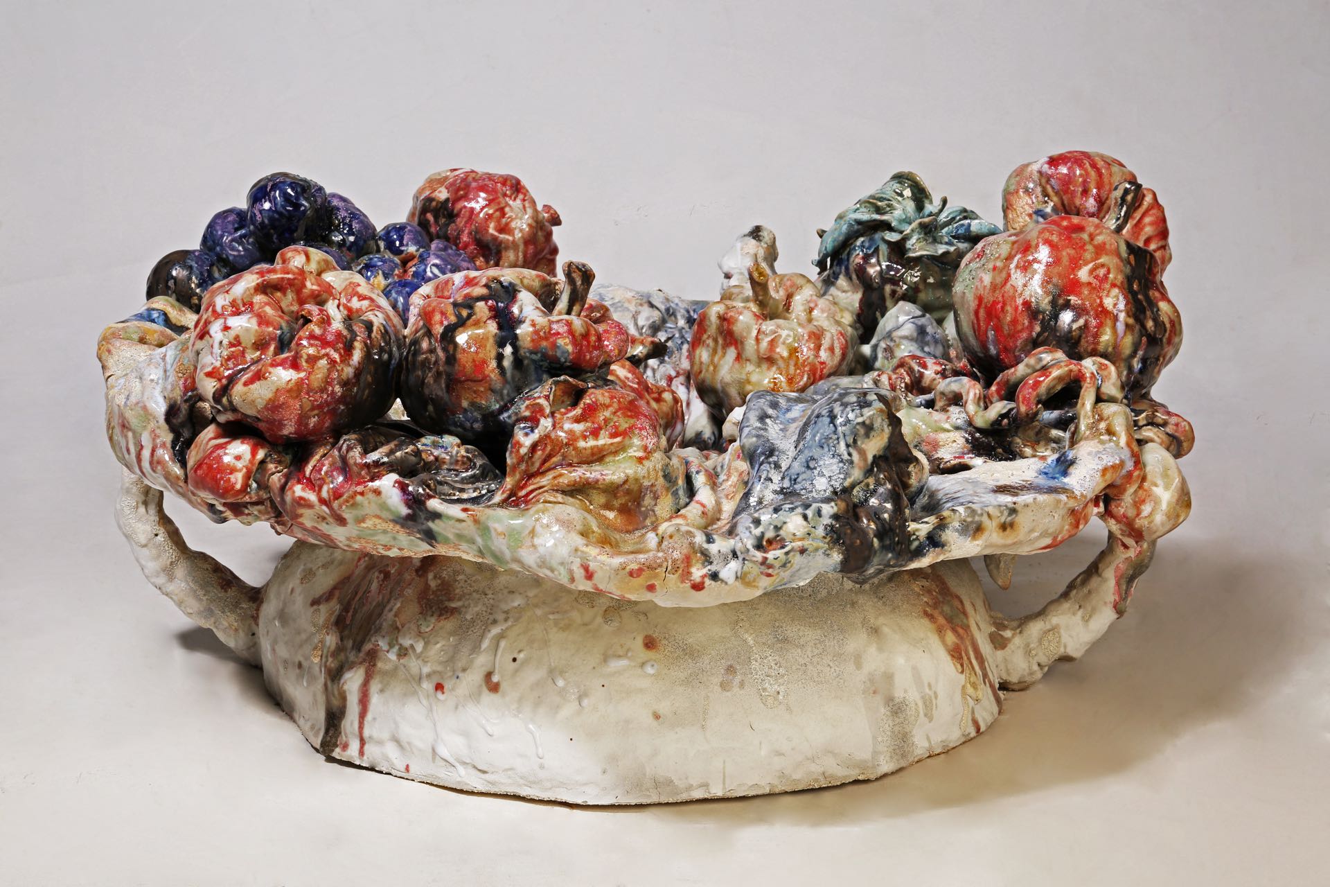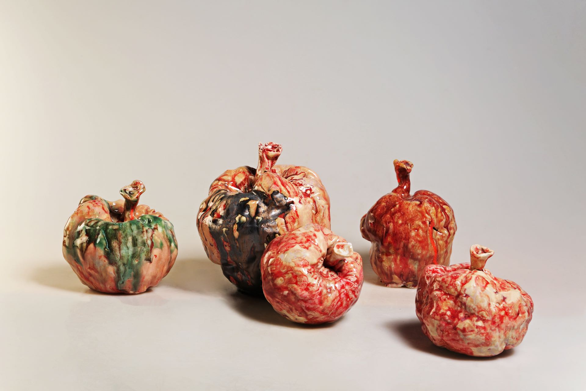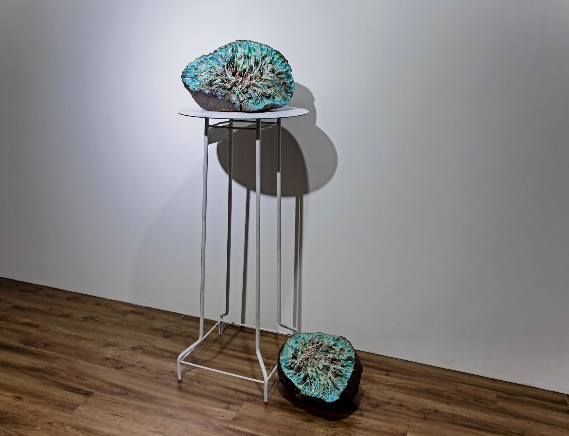 走進位於住宅大樓的新板藝廊中,穿越與一般社區無異的管理大廳走入展廳,不同於剛才安定的空間感,蔡佳宏的作品以「褶肉記」為名,無論形體輪廓是什麼,皆具有肉塊、臟器、血色的堆疊流淌特質,以不同佈局裝置構成本次展覽最主要的視覺敘事。藝術家以「褶」作為變形記,將陶藝的土質特性挹注血性特質,釉藥的色彩不僅在視覺上豔麗的割開了觀看者的瞳孔,同時也創造了造型物的重力與暗面,讓帶有孔雀藍、葡萄紫、血紅色的物件有了陰翳的色彩。同時藝術家在〈果〉系列更將物質性的觸角延伸至味覺,從像是橘皮的觸感、腐敗的果核、果實拔絲般的纖維到鮮彩汁液橫流的果實意象,皆創造出一種果肉鮮美至腐敗的時間過程感,在此「時間」在此加入物質與空間的領域,探討展現「衰敗感」的雕塑作品,時間具有怎樣的可能性。