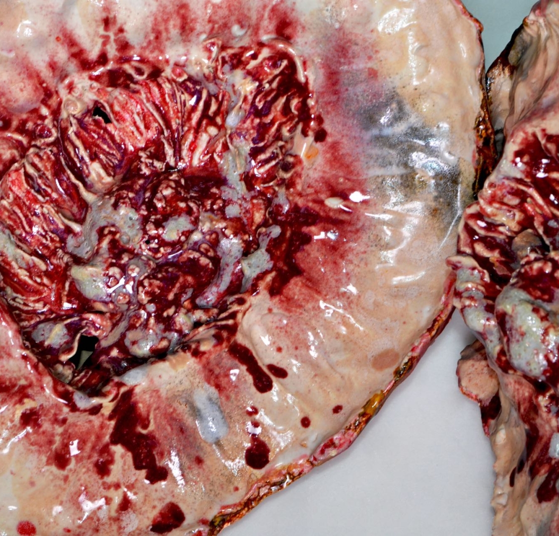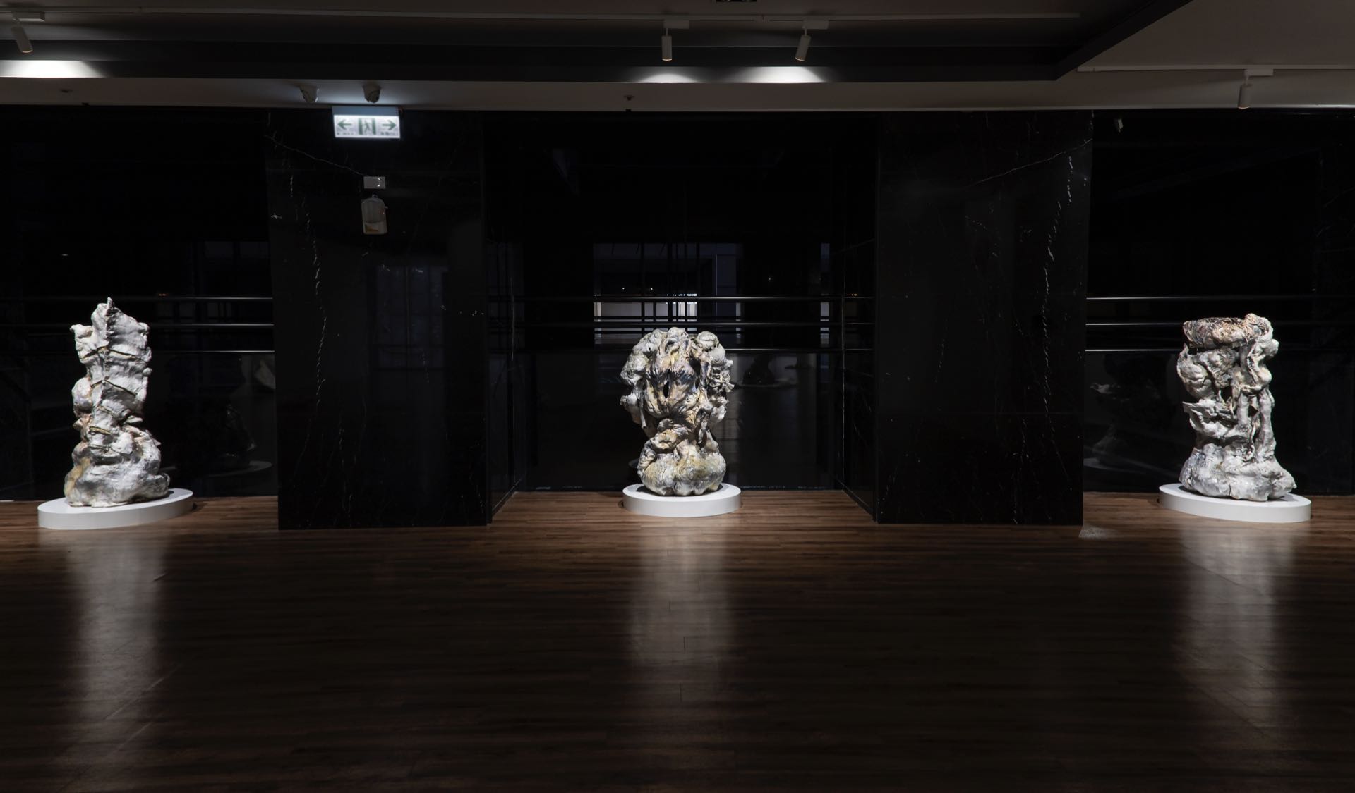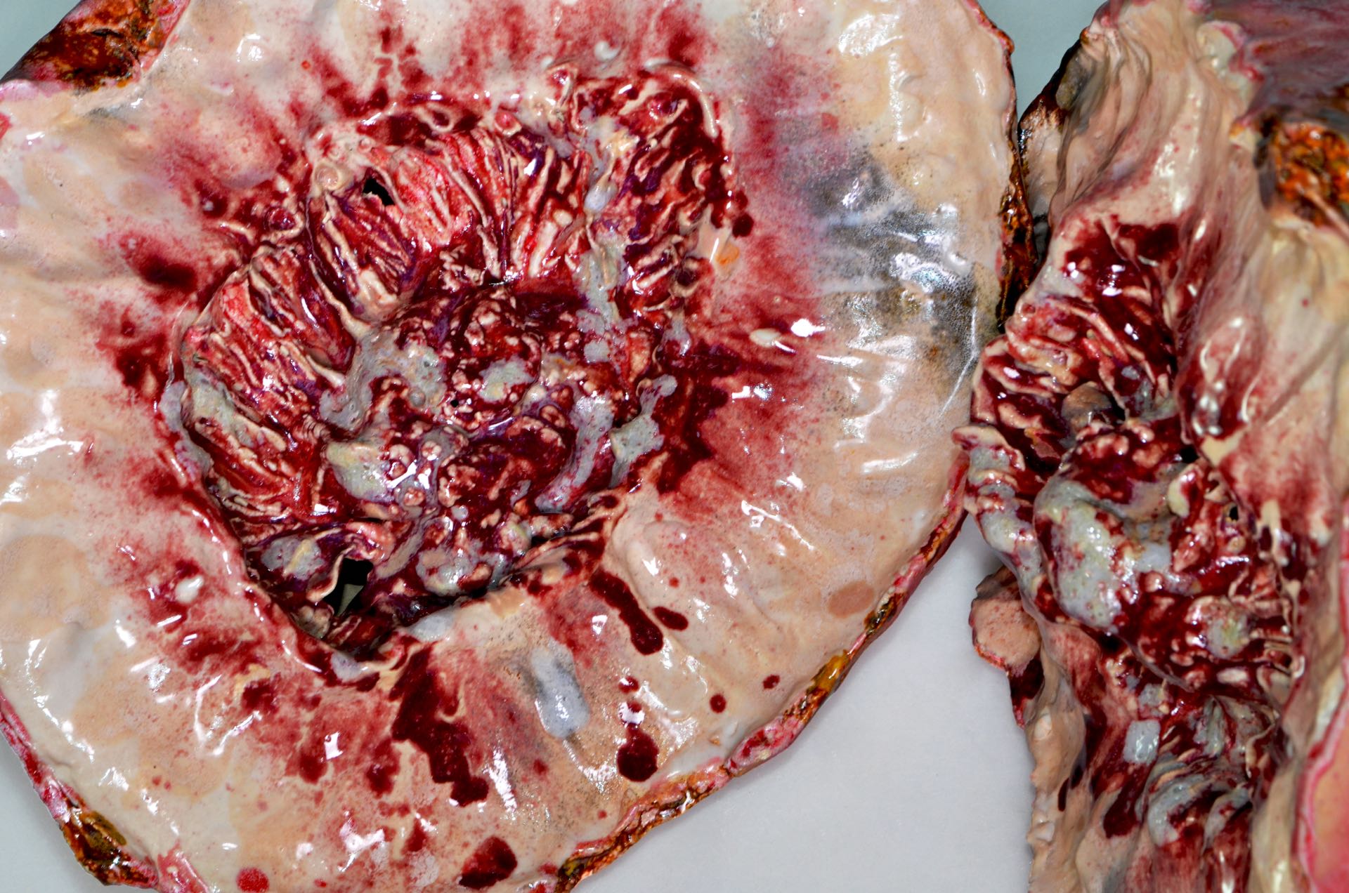 蔡佳宏的「褶肉記」無疑是極富作者性、物質性的創作,但在描繪日常的器物或訴說永恆的紀念碑之間,她選擇以病態繁複的血肉造型摧毀日常性,又以不同形象與釉料的精細描繪擬仿,擾亂了永恆的時間軸。這是一種「過度」與「衰竭」的循環與並置,那些不可還原主體的肉身臟器,過度的細節捏塑在陶土的裡外上下,就像是將五臟六腑從身體深處掏出重組般的鉅細靡遺,不斷將視覺在熟悉與陌生中擺盪最後成為孤立,觀展中的認知會逐漸在這之中衰竭,我們難以想像特定事件、特定病理所引起的情境,反而在不斷孤立的過程中感知到自己的身體、自己的歷史,從個人記憶深處挖掘出某種已知形式的痛楚、驚嚇、或悲傷,「褶肉記」為最私密、最無以名狀(unspeakable)的創傷經驗秘密開闢一條甬道,以或許療癒性的、強迫性的、沉思性的時空,將雕塑的時間性延伸至私人史之中。