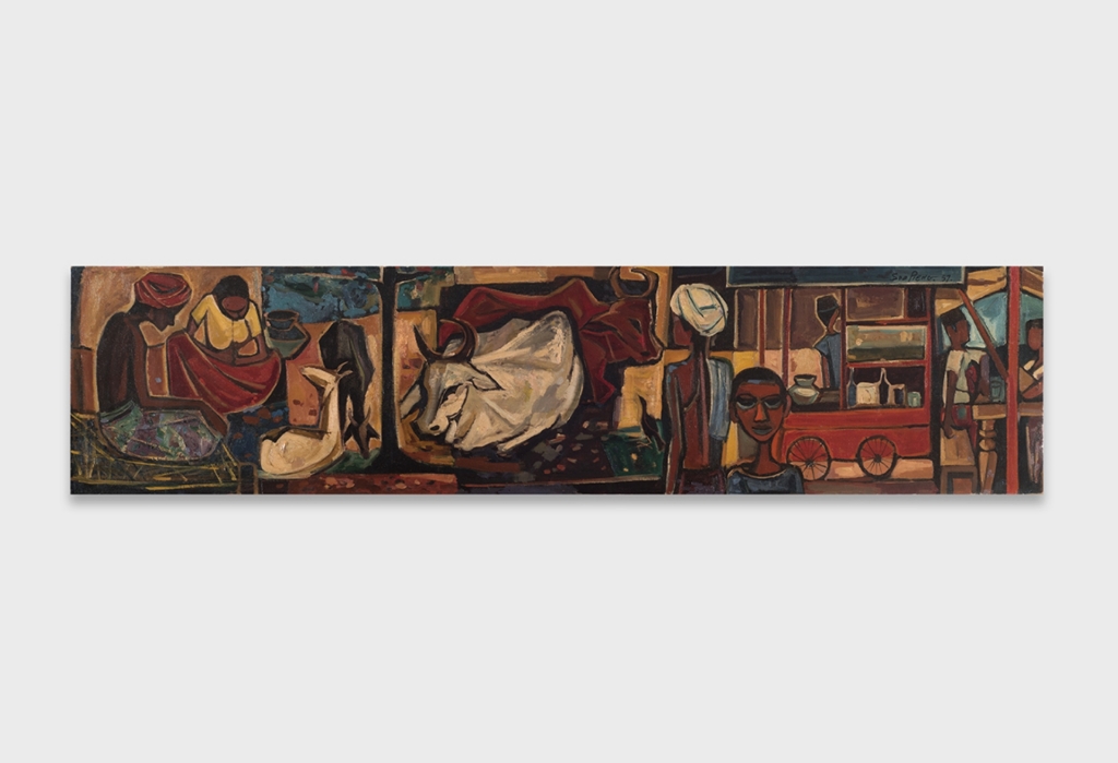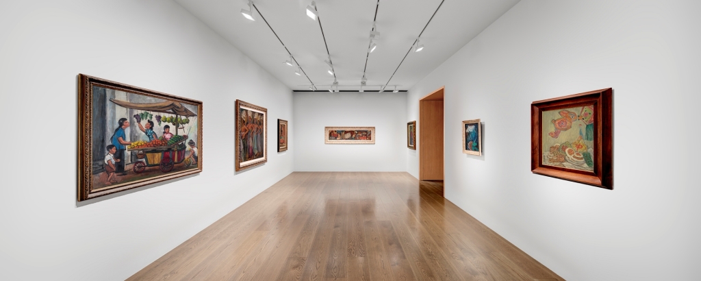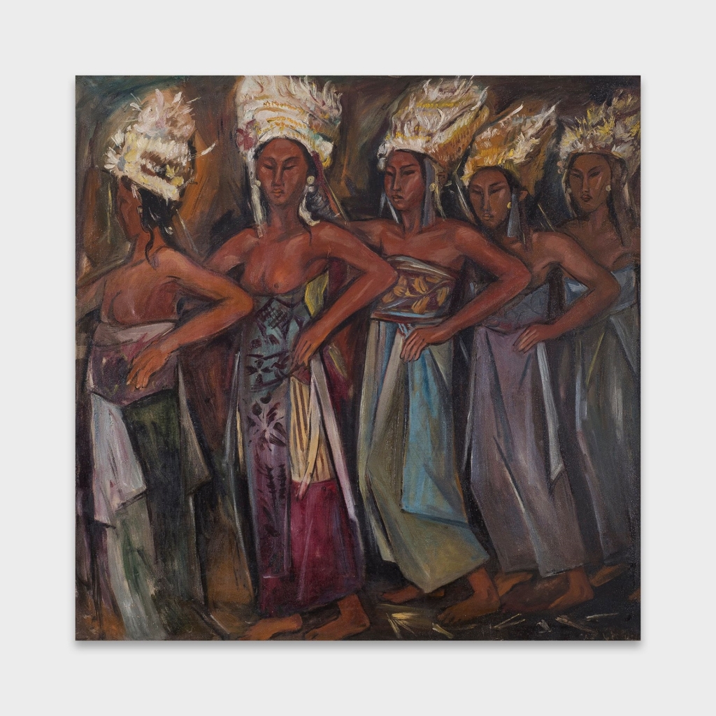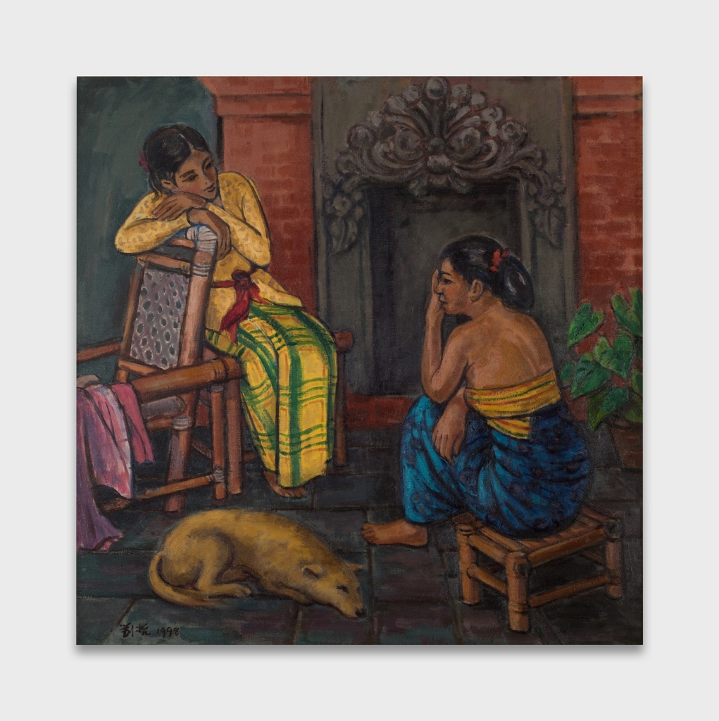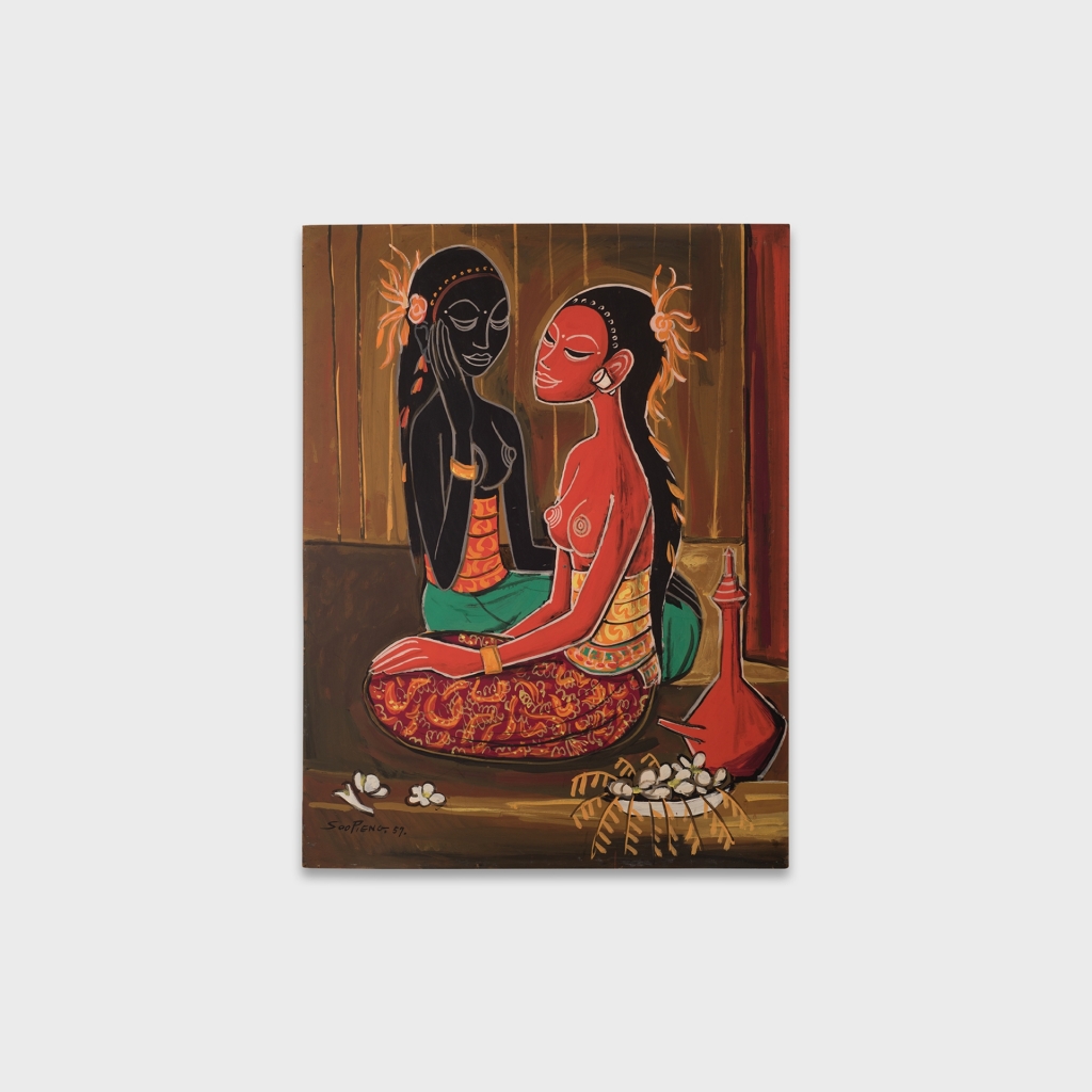 綜覽新加坡藝壇最具影響力的先驅藝術家陳文希,在本展有六件焦點作品,創作於1950年代初期的《峇里女郎》(約1950年代)反映其遊歷印尼的經驗,在看似概念化的女子群像中,皆有不同的細節描繪。而相同題材亦有鐘泗賓的《兩峇里女郎》(1957),女子誇張化的五官與纖細身形則可見印尼傳統哇揚皮影戲的啟發,兩者的濃麗用色都呼應熱帶風情的意象。此外,本次展出的六件鐘泗賓作品共呈現長達三十年的創作跨度,其中一件尺幅近兩米的《馬來生活》(1957)以手卷形式鋪展開來,將不同民族的生活群像並置;而劉抗的《水果商販》也同樣呈現出街市人物的活力。