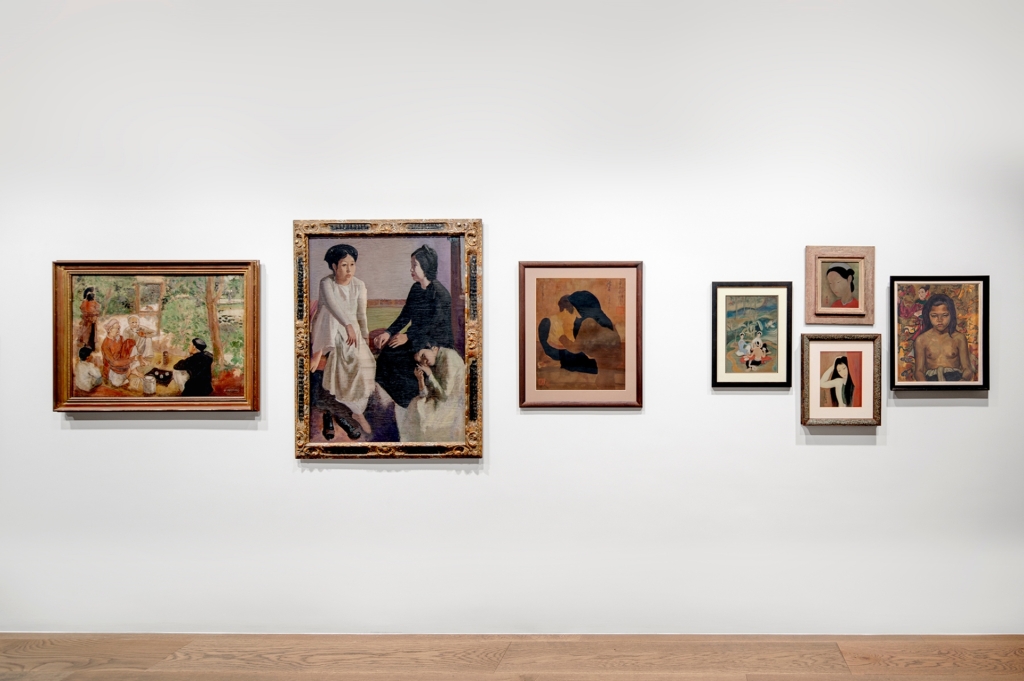 在展覽的佈置呈現上,則可見到將越南繪畫密集地擺掛於牆面,作為對巴黎沙龍式展覽的致敬,藉此遙相呼應本次參展的越南藝術家大多在1931年殖民地藝術展首度於國際展出的史實。此外,本次展覽並非僅限於越南裔藝術家,同場亦呈現法國女性藝術家Alix Aymé的作品,以提供1930年代於越南藝壇所呈現的多國文化元素。Alix Aymé曾為納比派(Nabis)藝術家莫里斯.德尼(Maurice Denis)的學生,也曾前往中國進行考古研究,當中含括了對於傳統漆藝的考察,之後她在EBAI任教時也將此技法傳授給學生,其中包括日後以漆畫創作著稱的阮嘉智。而Alix Aymé亦早在1931年的殖民地藝術展參與展出漆畫作品,都應證著當時融會東西方創作的普遍現象。至於場中另一亮點,則為成長年代更晚的阮忠(1940年生),也同樣以描繪氣質溫婉的東方女性形象見長,由此可窺見越南現代繪畫風格與脈絡之延續。而南洋藝術家劉抗創作於1990年代晚期的《沈默的美人》,在主題與構圖上與經典的越南仕女繪畫也有高度連結。