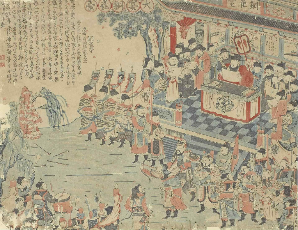第一部分,展示了明末清初到近代各種與傳說、故事、物語有關的版畫。在這些作品中,除了如〈大宴銅雀臺〉(圖2)這類明代印刷書籍插圖所展現出的繪畫美感,各式各樣的表現手法也是一大看點。此外,蘇州版畫中存在著許多並未保留在繪畫或書籍裡,可能以口傳文學、彈詞或戲劇聞名於當時的故事。