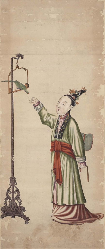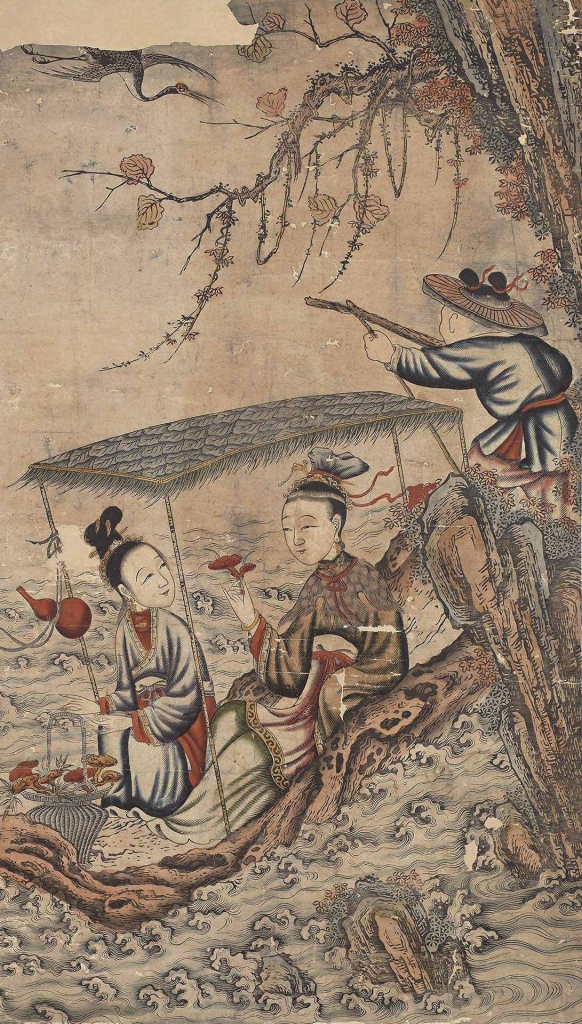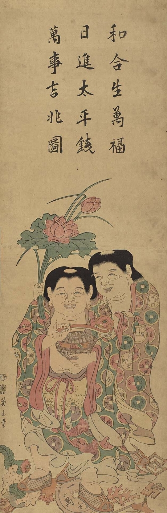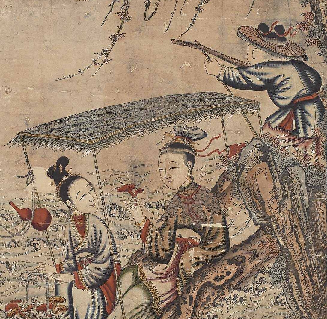 第三部分,展示了描繪人物的作品。清初時,多以宮中高貴女性的優雅生活為主題(圖4,至清末則開始描繪宮廷之外人們的形象。這時期的人物版畫不僅造型美麗,其中多子多孫、出人頭地、富貴長壽等吉祥元素也受到人們的重視。