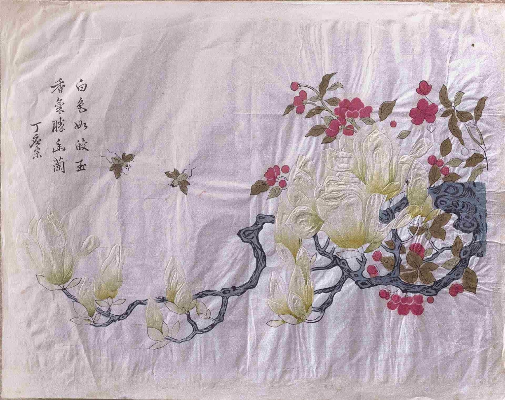 第四部分,展示了花鳥畫。早在日本開始出現真正的浮世繪版畫前,中國就已製作出以套印(多色摺)或拱花(空摺)等技法的精美單張花鳥版畫。當中值得一提的,大概就是雍正年間(1723-1735)至乾隆(1736-1795)初期由丁亮先(生卒年不詳)或丁應宗(生卒年不詳)(一說此二人為同一人)所製作的一批版畫。其不使用墨版,而僅用色版和拱花,便鮮明而立體地表現出花朵姿態(圖5)。