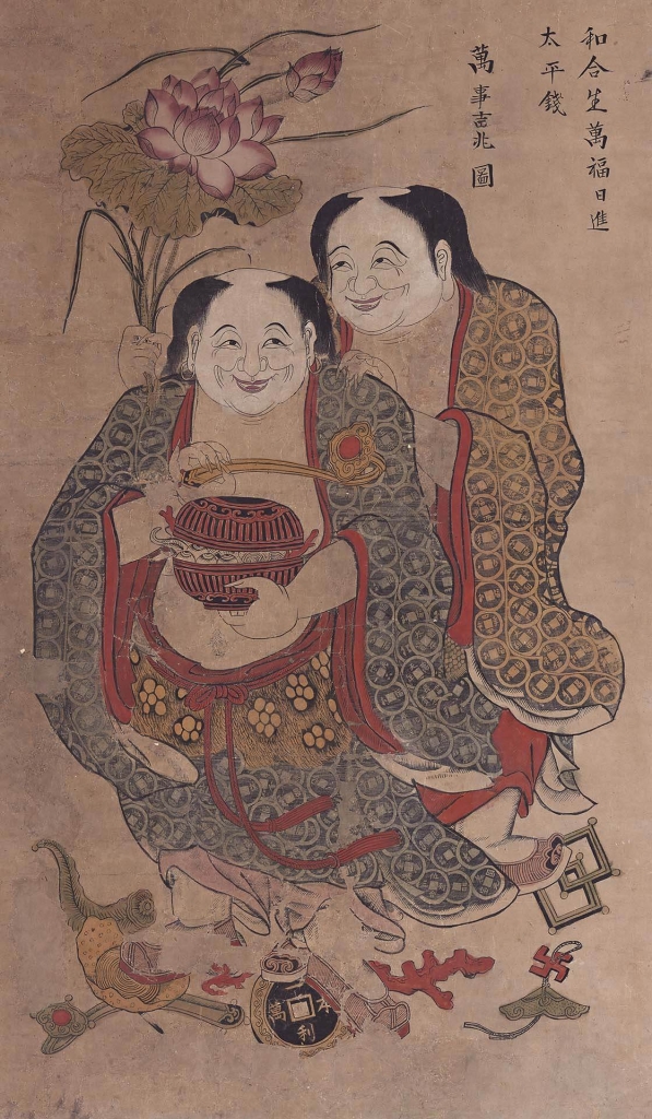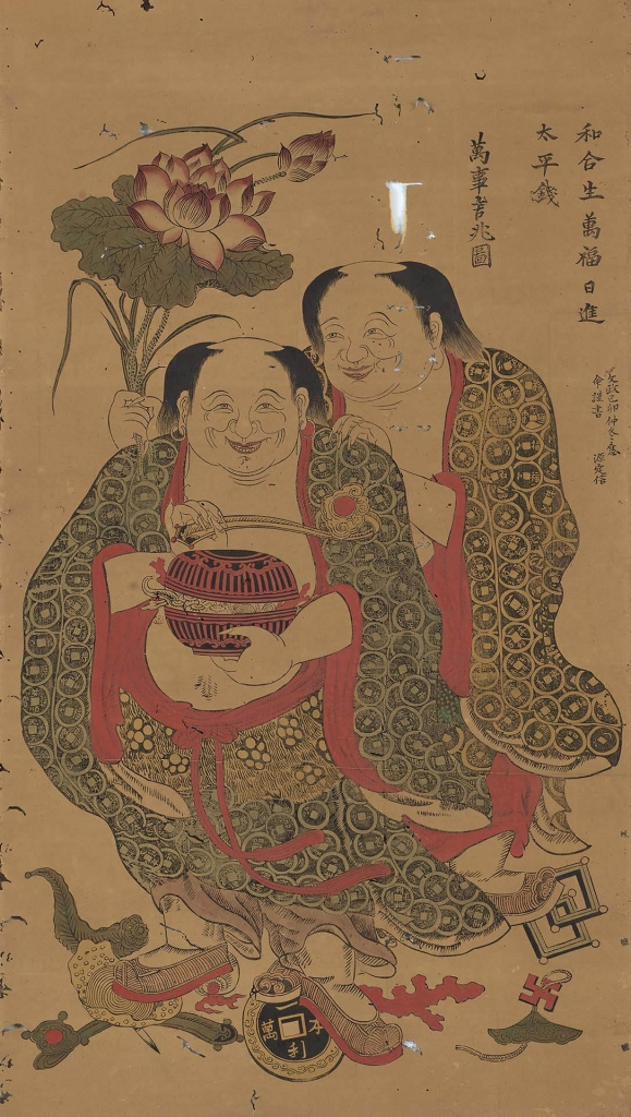 第二部分則是神佛與聖人像。市井之間供奉著許多描繪道教或民間信仰諸神的版畫,像是慶祝壽誕時用作裝飾的老壽星或西王母賀壽圖(圖3),或是展現民間信仰之開放包容性、以多種組合描繪的福祿壽三星圖等,都可說是中國版畫特有的表現範疇。三國名將關羽原是人類,後被神化為「關帝」,並且在不知不覺間被描繪成如同佛教繪畫中的三尊像形式:關羽居中,兩旁隨侍周倉和關平,反映了關羽信仰中神像表現的變化。