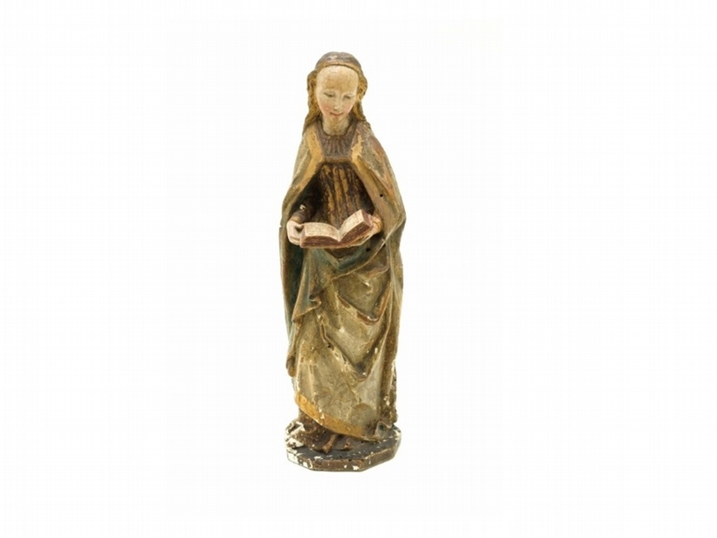 1480年代萊茵河下游地區〈Virgin Annunciate or Female Saint Germany〉,洛杉磯郡立美術館藏。(圖/林頎玲)