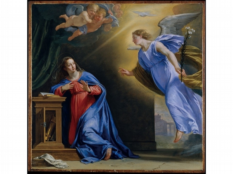 歐洲宗教畫以紅衣藍袍作為聖母衣著的傳統十分悠久,見Philippe de Champaigne1644年作〈The Annunciation〉,大都會藝術博物館藏。(© The Metropolitan Museum of Art)