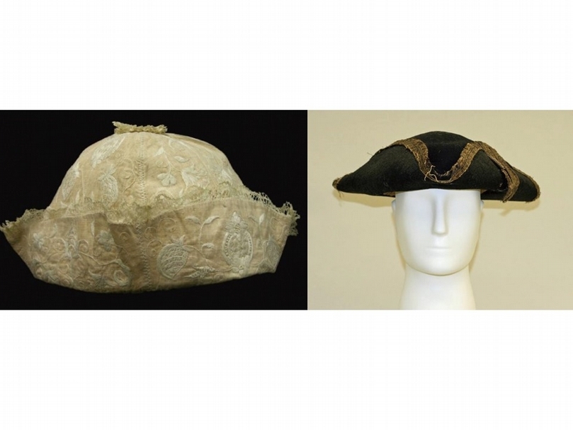 (右)法蘭西國的男子頭戴圓形便帽。1730年代至1760年代,White Embroidered Cap,美國威廉斯堡藝術博物館藏。(圖/林頎玲);(左)18世紀男性配戴的黑色三角帽Tricorn,大都會藝術博物館藏。(© The Metropolitan Museum of Art)